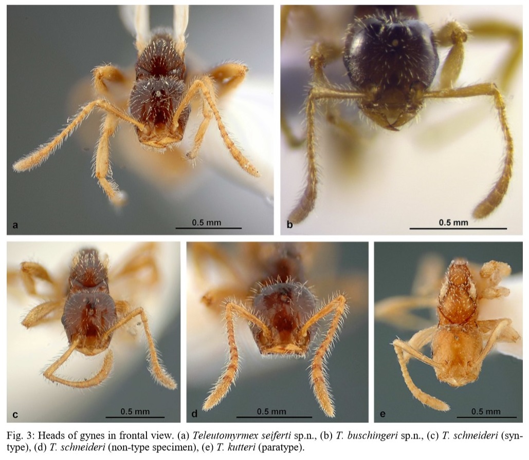 Kiran, K., Karaman, C., Lapeva-Gjonova, A. & Aksoy, V., 2017, “Two new species of the “ultimate“ parasitic ant genus Teleutomyrmex Kutter, 1950 (Hymenoptera: Formicidae) from the Western Palaearctic.“ Myrmecological News, vol. 25, p. 145-155.