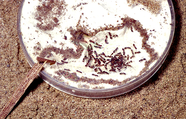 Zwischen Deckel und Gipsboden in einer Petrischale haben die Tiere einen Ringwall um ihren Nestbereich aus Sand gebaut,
