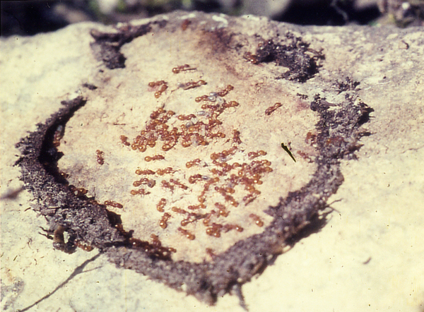 Ein Naturnest derselben Art in einer Steinspalte. Der Ringwall wurde aus "Debris", allerlei Partikeln aus der Nestumgebung,