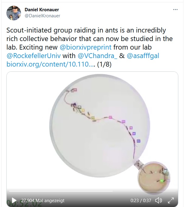 Das „mass raiding“ der Heeresameisen, bei dem Tausende von Arbeiterinnen gleichzeitig das Nest verlassen und zur Jagd ausschwärmen, hat sich aus dem „group raiding“ entwickelt, bei dem eine Kundschafterin eine kleine Gruppe zu einem bestimmten Ziel führt. In der Veröffentlichung lassen sich weitere interessante Videos starten!