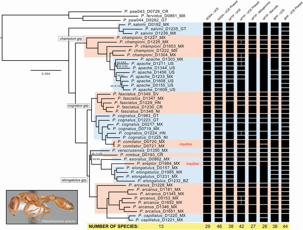 Abb.-Text: Phylogeny and molecular species delimitation results for the P. elongatulus species group. The presented phylogram was inferred from 2,006 unphased UCE loci using the SWSC-EN partitioning scheme and the program IQ-Tree v2.1.1. Support values are ultrafast bootstrap (UFB) and SH-like approximate likelihood ratio test (SH-aLRT) percentages; nodes without support values have maximum support (100/100). Clades are colored by the final species delimitation. Results from the molecular species delimitation methods SODA, bPTP, and BPP are presented to the right of the phylogeny, with each black box indicating one species.
