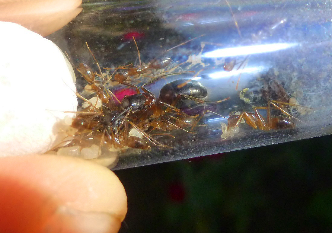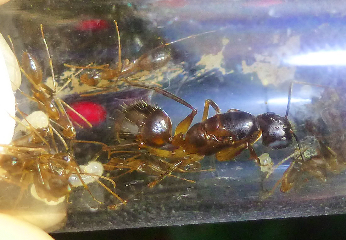 ich habe nun eine hübsche, schlanke Camponotus aus Malaysia abzugeben, nachdem die Königin bei mir gegründet hat. Es handelt sich um eine mittelgroße, gelbbraun gefärbte Art, deren Majore schwarze Köpfe haben. Sie kommen natürlicherweise im tropischen Regenwald vor und belaufen gerne auch Büsche und Bäume; dementsprechend sind sie recht flott unterwegs und ich konnte ab und zu beobachten, dass kleine Distanzen per Sprung überbrückt wurden. Ein bepflanztes Becken wäre für diese Art optimal, aber natürlich nicht zwingend notwendig.