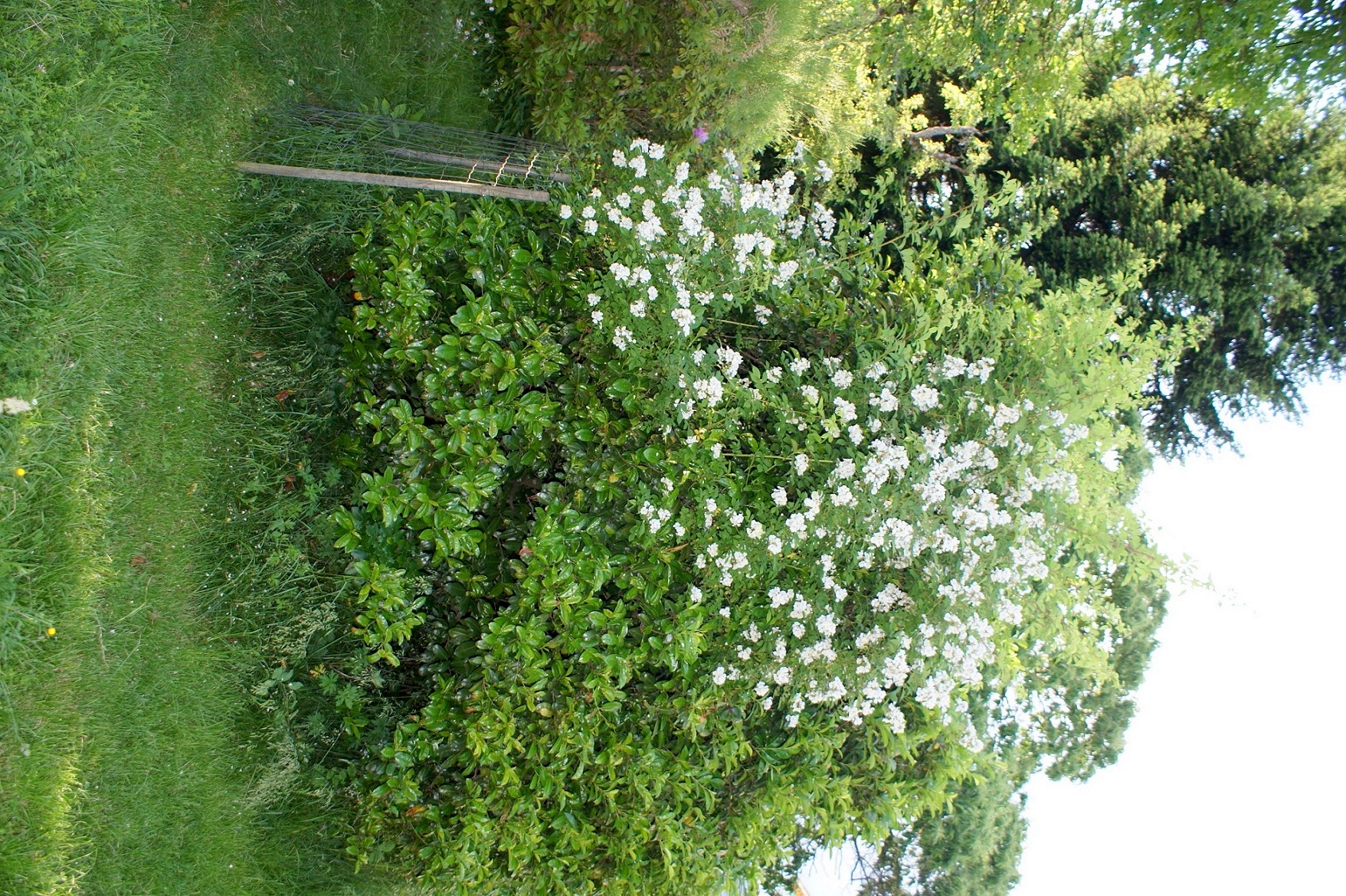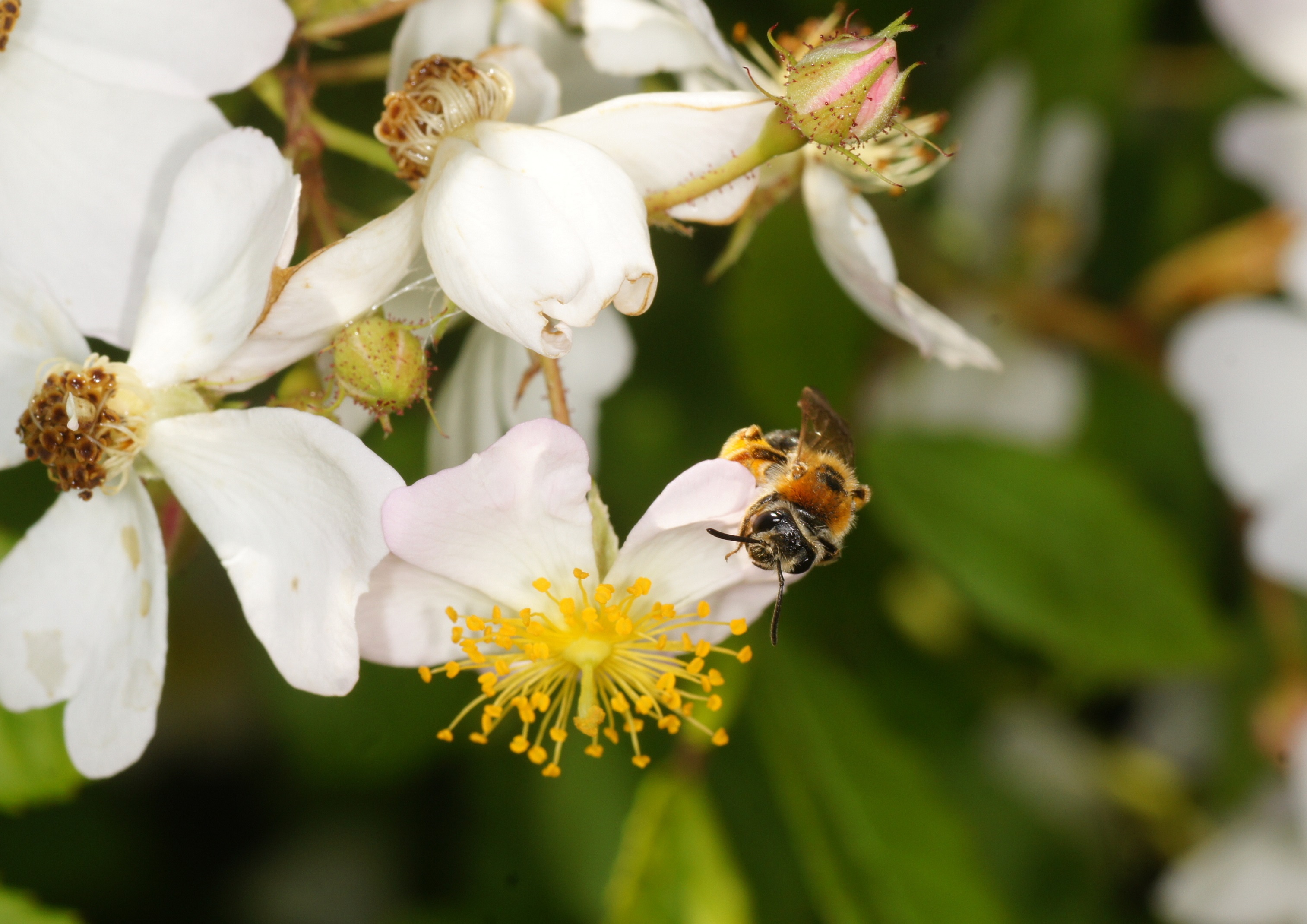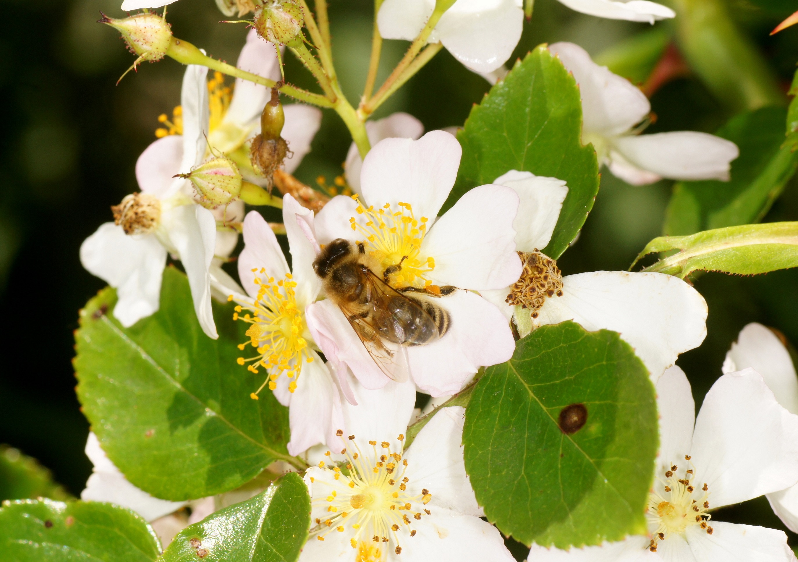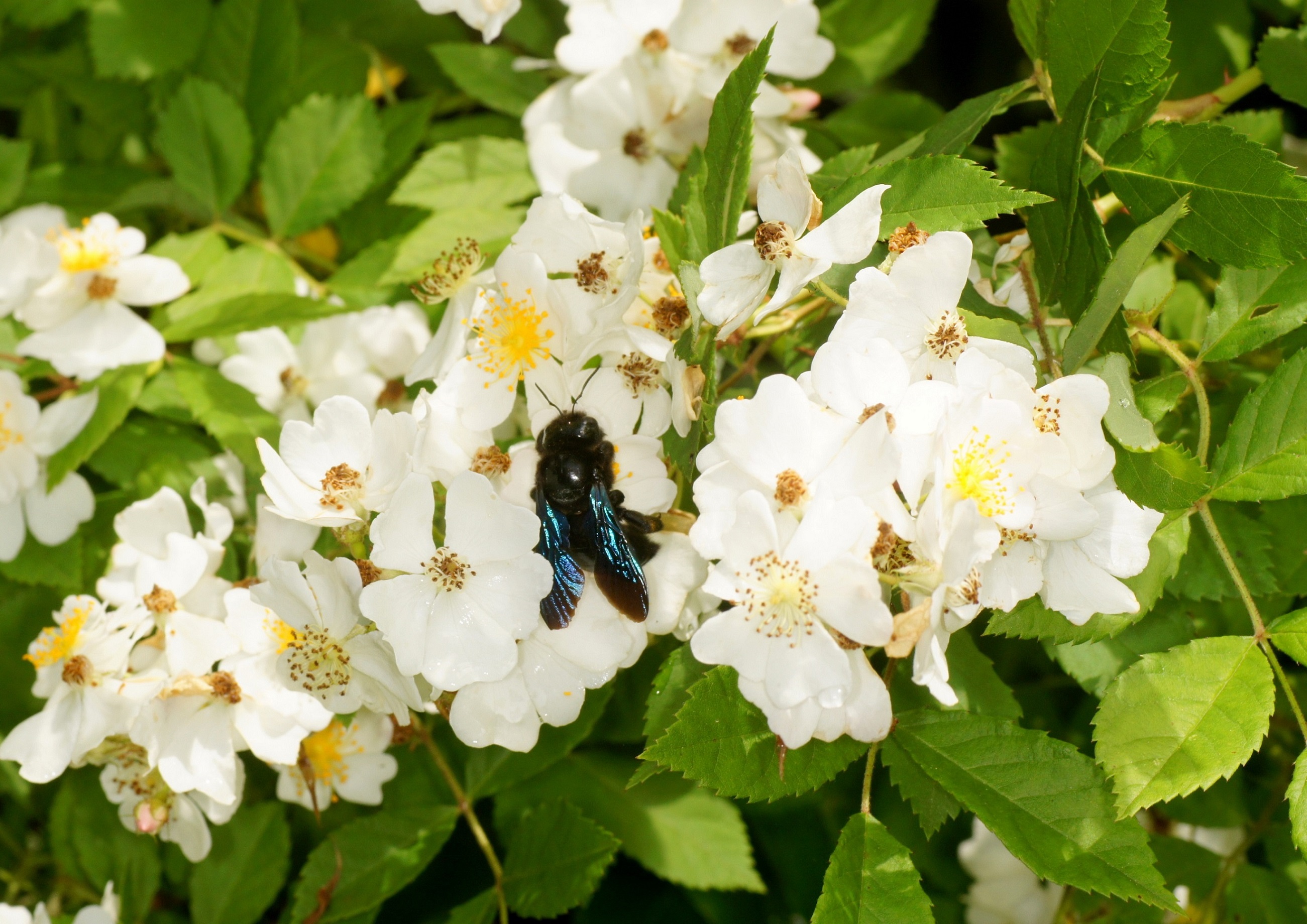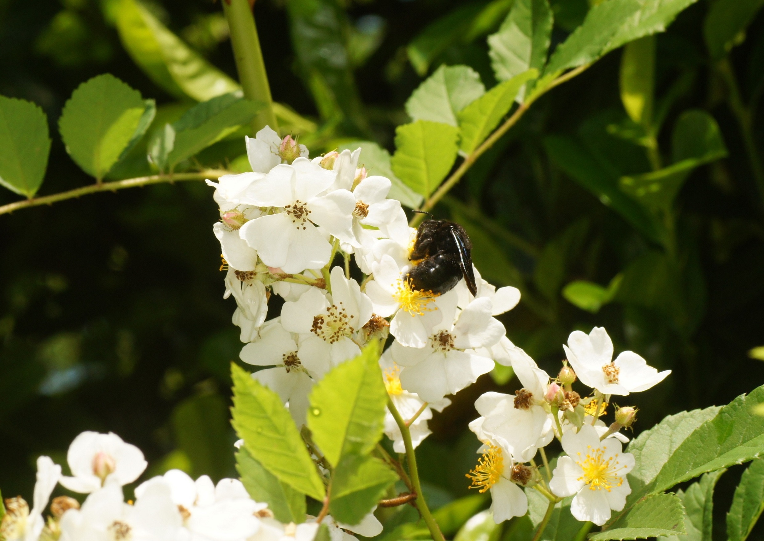 Die wilde Rose verbreitet sich bei uns ohne Zutun des Menschen. Mein vor fast 50 Jahren gesetzter Kirschlorbeer Prunus laurocerasus wird von der Rose derzeit überwuchert. Ich lasse es geschehen, weil die Blüten beider Pflanzen für Insekten sehr interessante Nektar- und Pollenlieferanten sind. Vor 2 Tagen beim Vorbeigehen: Kleine und große Bienen als Besucher!