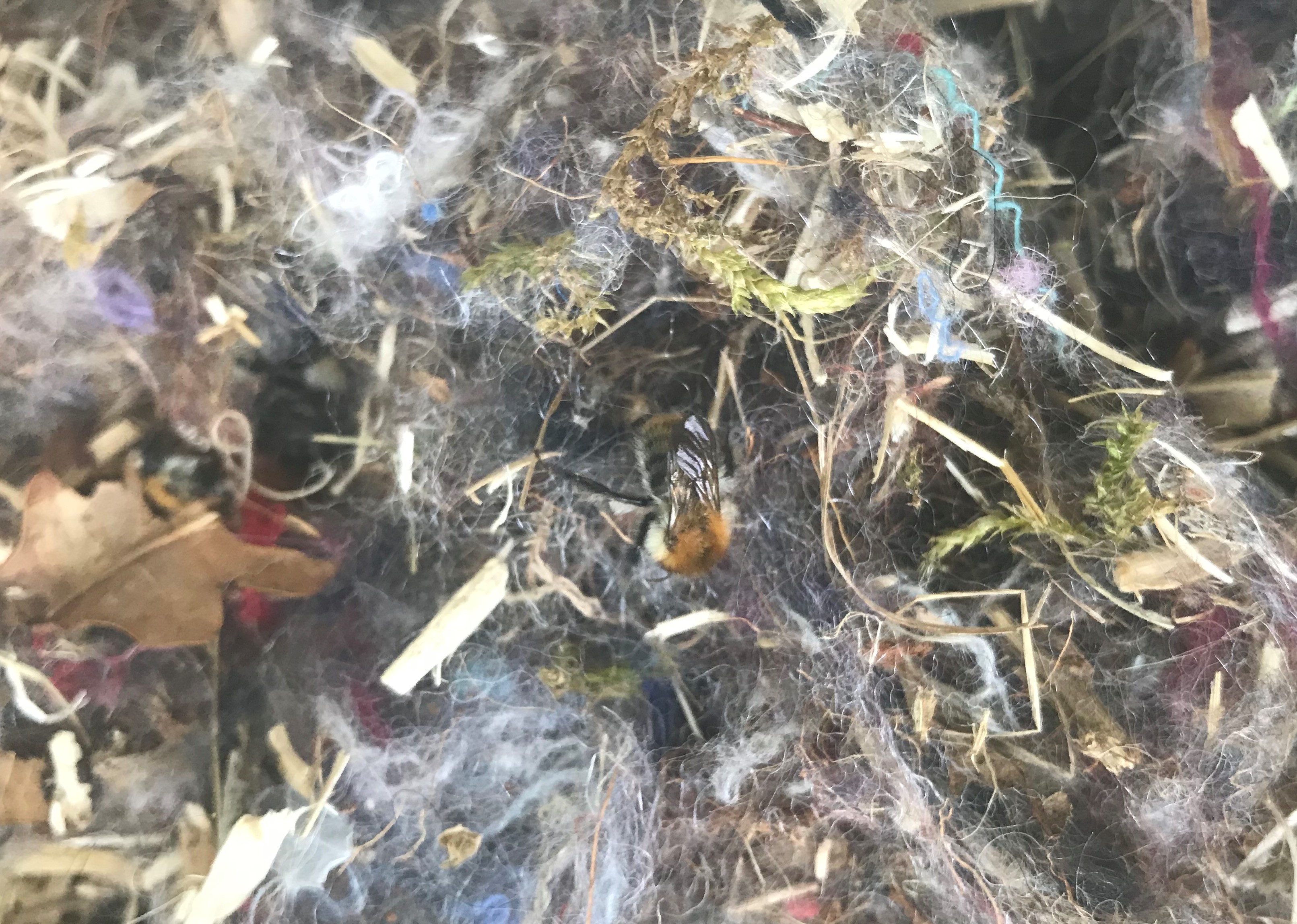 Aber jetzt kommts: Endlich hat auch eine Hummel den Kasten in Beschlag genommen. Eine kleine Baumhummel-Königin (Bombus cf. hypnorum) Ackerhummel, Bombus cf. pascuorum (vielen Dank und liebe Grüsse an Frank und Phil aus dem Eusozial, für den Hinweis!) versucht auf dem Kastenboden zu gründen. Dass dieses Unternehmen mit solchen Nachbarn gelingen kann, ist wohl eher unwahrscheinlich. Aber auch die leben gefährlich. Ich bin ja mal gespannt, wie es weiter geht.