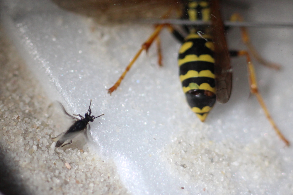 Das Völkchen ist allerdings klein geblieben. Manchmal sah ich fünf oder sechs Wespen darauf. Vermutlich haben die sehr hohen Temperaturen doch die Eier und/oder