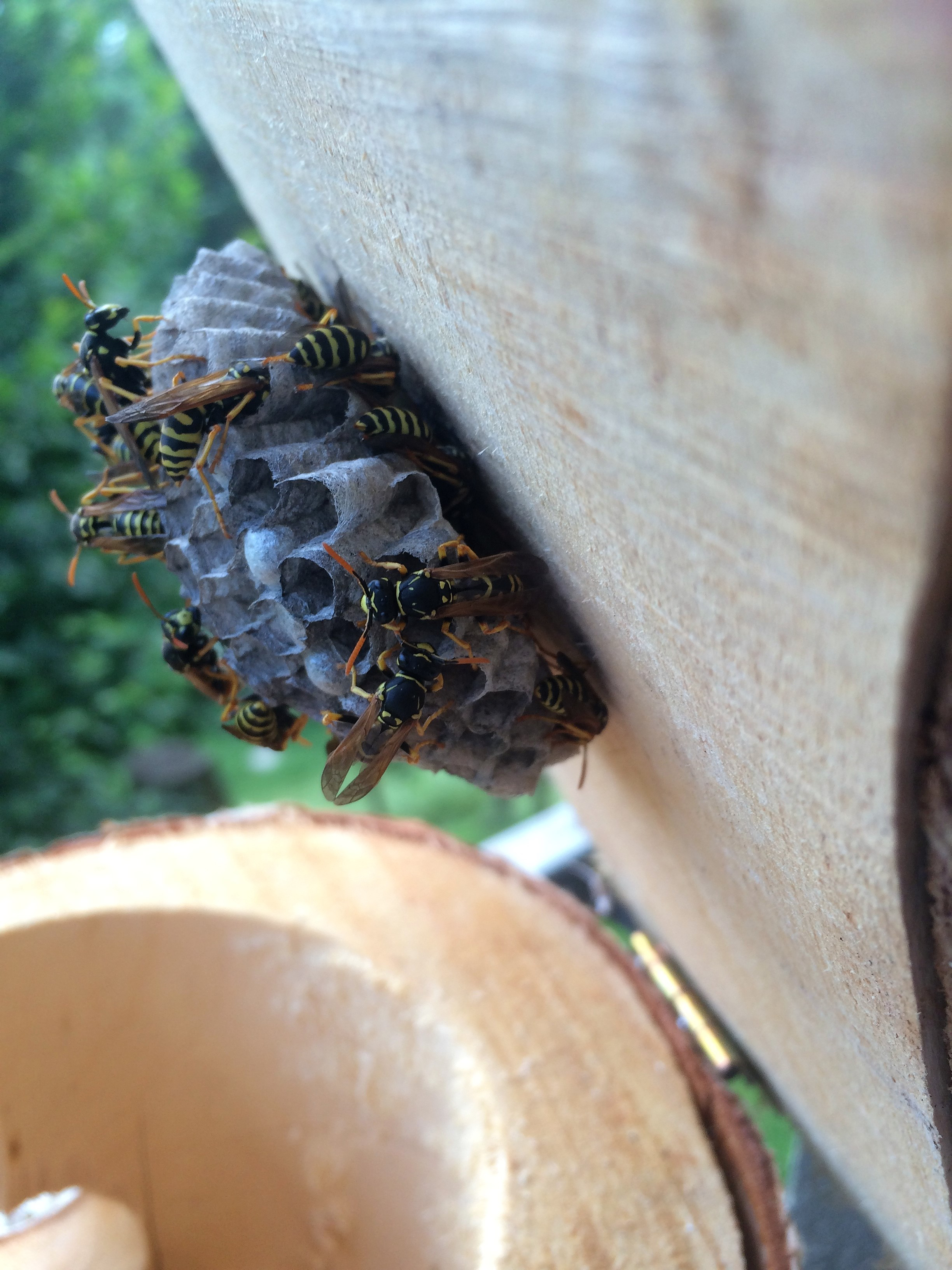 Polistes-Königin gebaut! Ich habe das Brettchen öfter etwas herausgezogen, mich den bösen Blicken der Königin und ihrer bald erschienenen Arbeiterinen ausgesetzt, und es