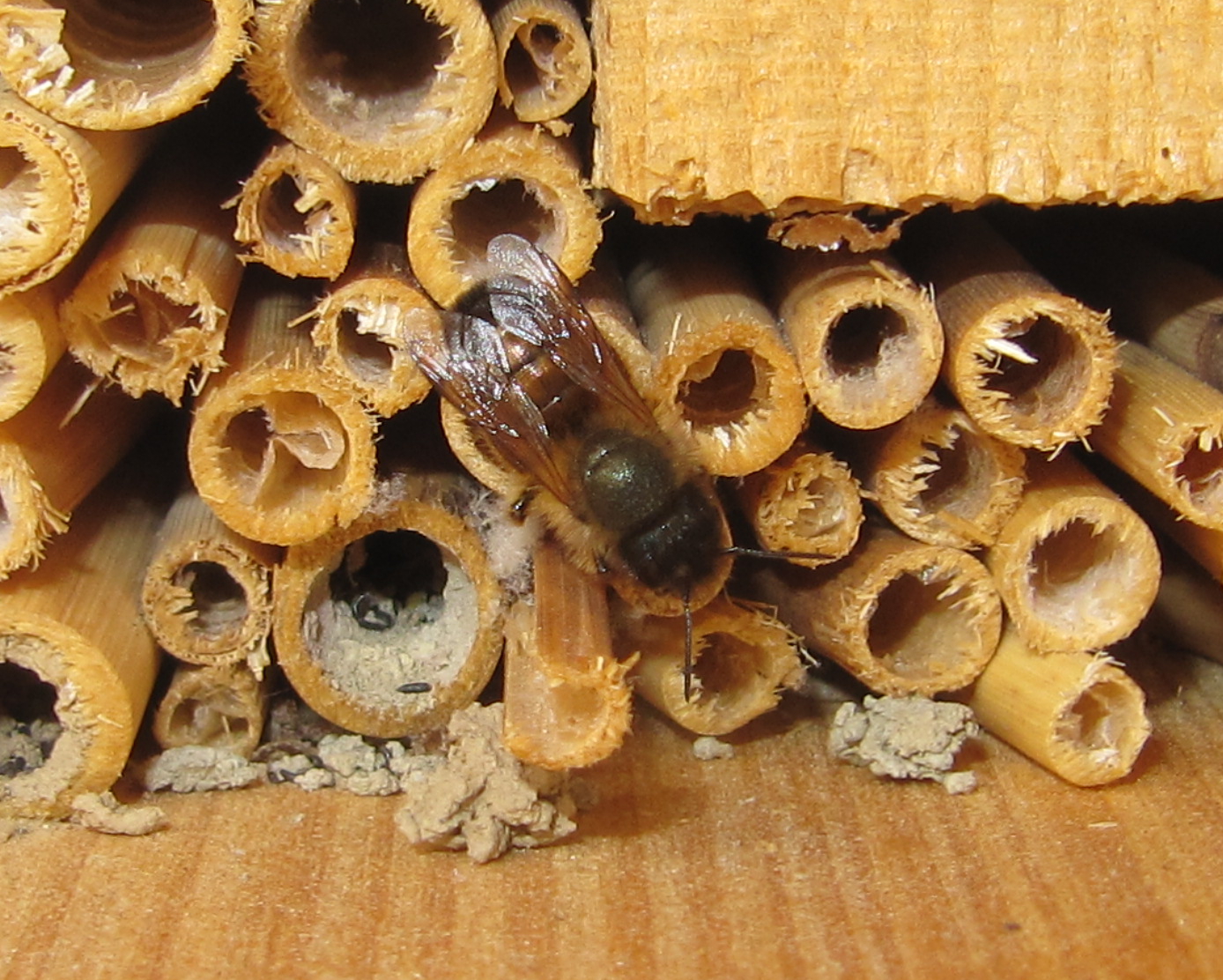 Inzwischen wird nun auch die kleine Nisthilfe an der Hütte, die ich letztes Jahr angebracht habe genutzt und teilweise bereits versiegelt und auch die neue, die ich kurzfristig angefertigt habe, ist bereits in Benutzung.