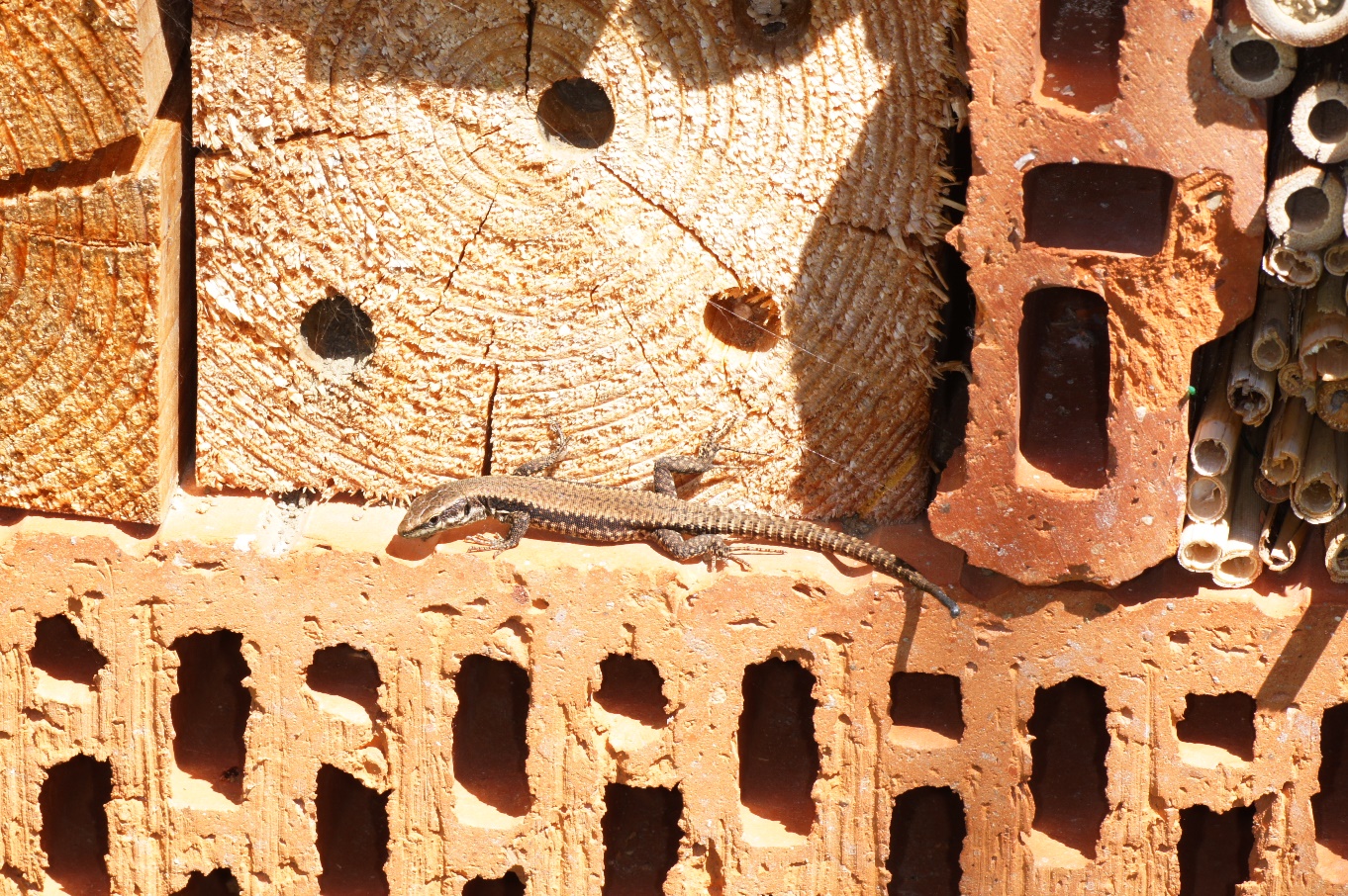 Nun, mit Osmia cornuta ist es ziemlich vorbei, dafür habe ich einen neuen Hotel-Gast. Ich habe befürchtet, dass die Eidechse die Bienen als Nahrung betrachten wird, konnte aber beobachten, dass dieses junge Exemplar den anfliegenden Bienen ausweicht, zum Glück!