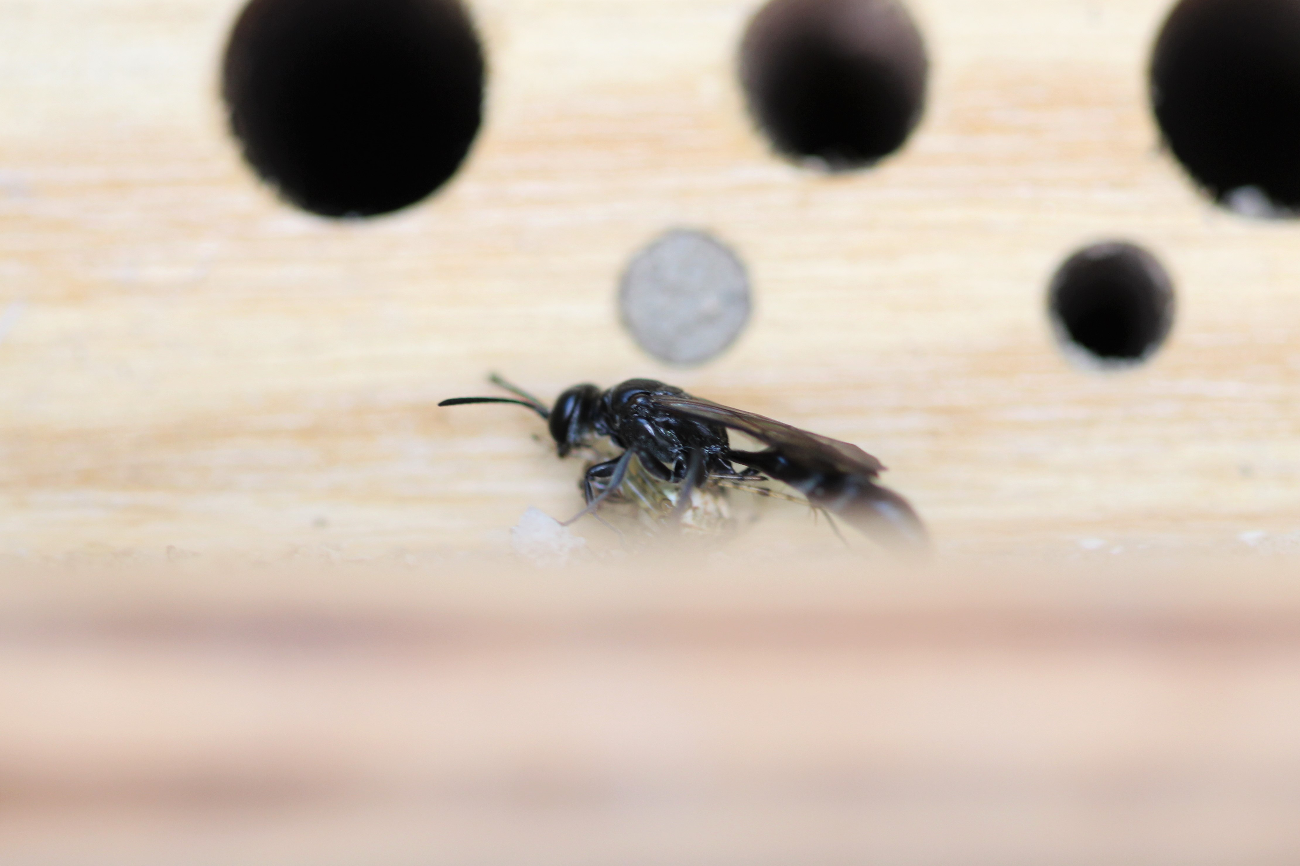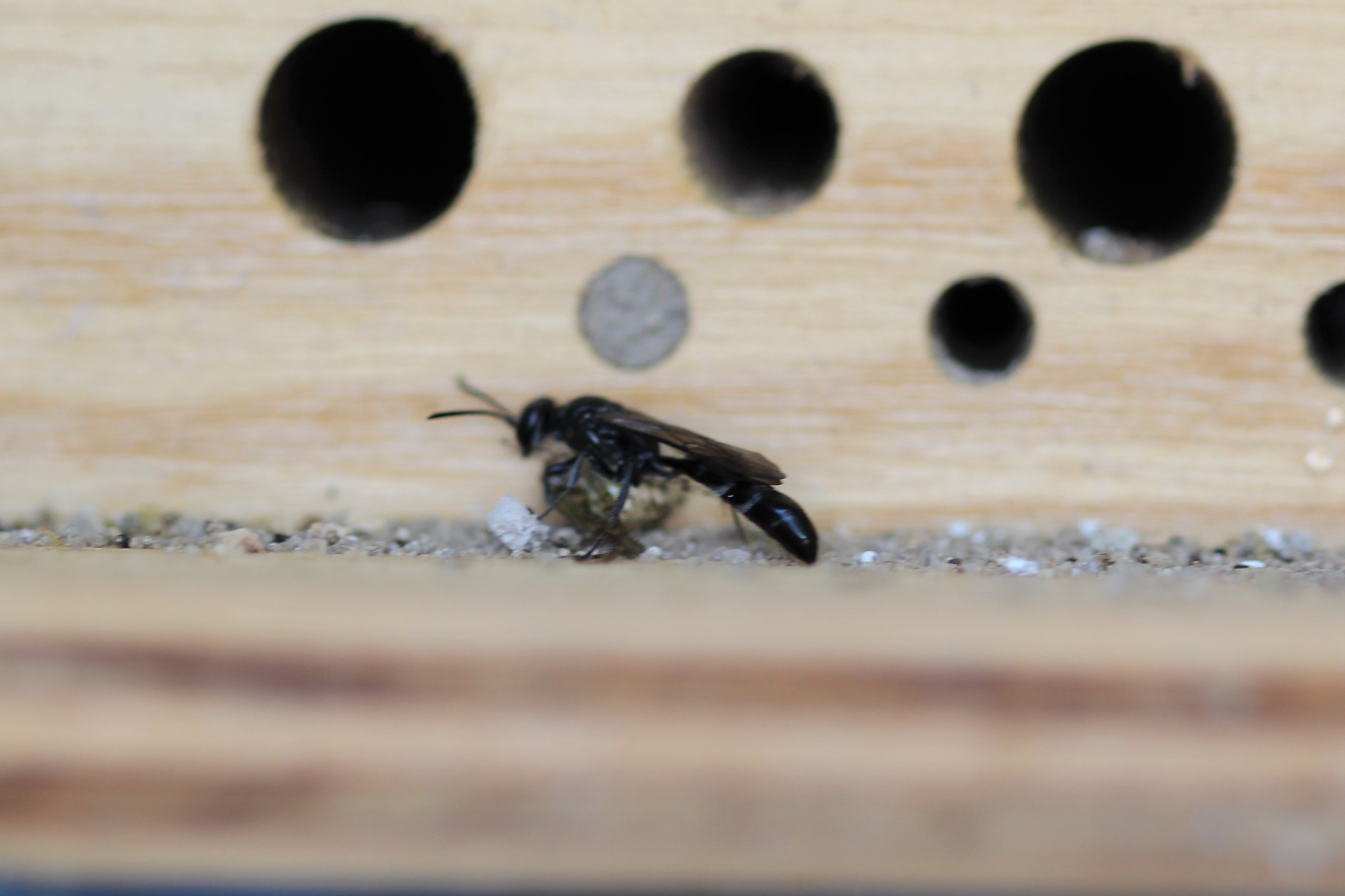 Nun ist auch eine Grabwespenart am Start. Es dürfte sich um eine aus der Gattung Trypoxylon oder Pemphredon handeln. Bestimmen kann ich die Tiere nicht sicher, aber zu Trypoxylon figulus passen meine Beobachtungen wie die Faust aufs Auge: Die Art ist häufig und auch in Gärten anzutreffen. Sie benützt bereits vorhandenen Hohlräume und ist deshalb auch an Nisthilfen oft zu finden. Sie trägt Spinnen ein. Die weibliche Wespe ist ca. 12 mm lang, hat einen sehr schlanken, komplett schwarzen Körper mit langem Hinterleib.