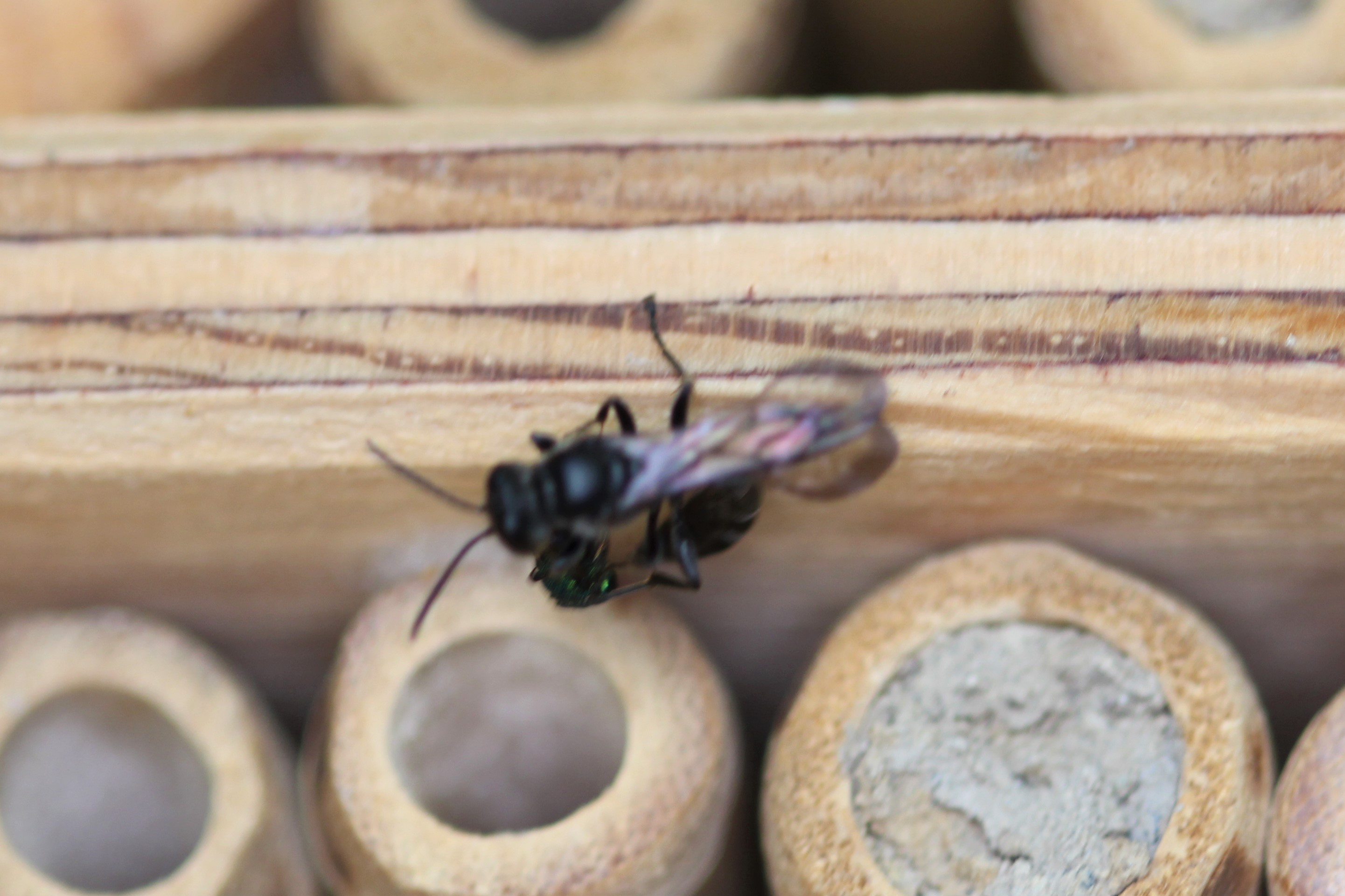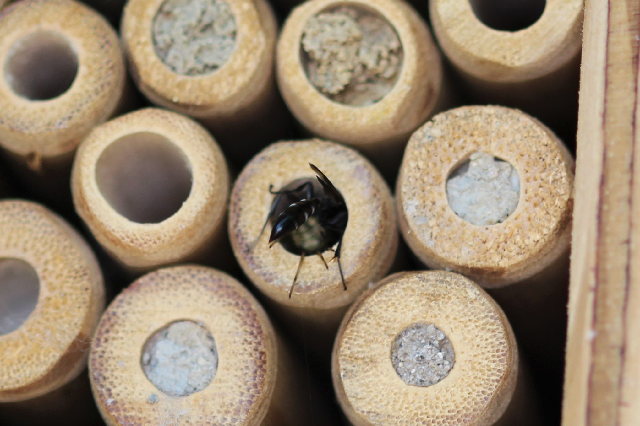 An meiner Nisthilfe ist inzwischen eine kleine Polistes Art eingezogen und bewohnt ein ganzes Stockwerk.