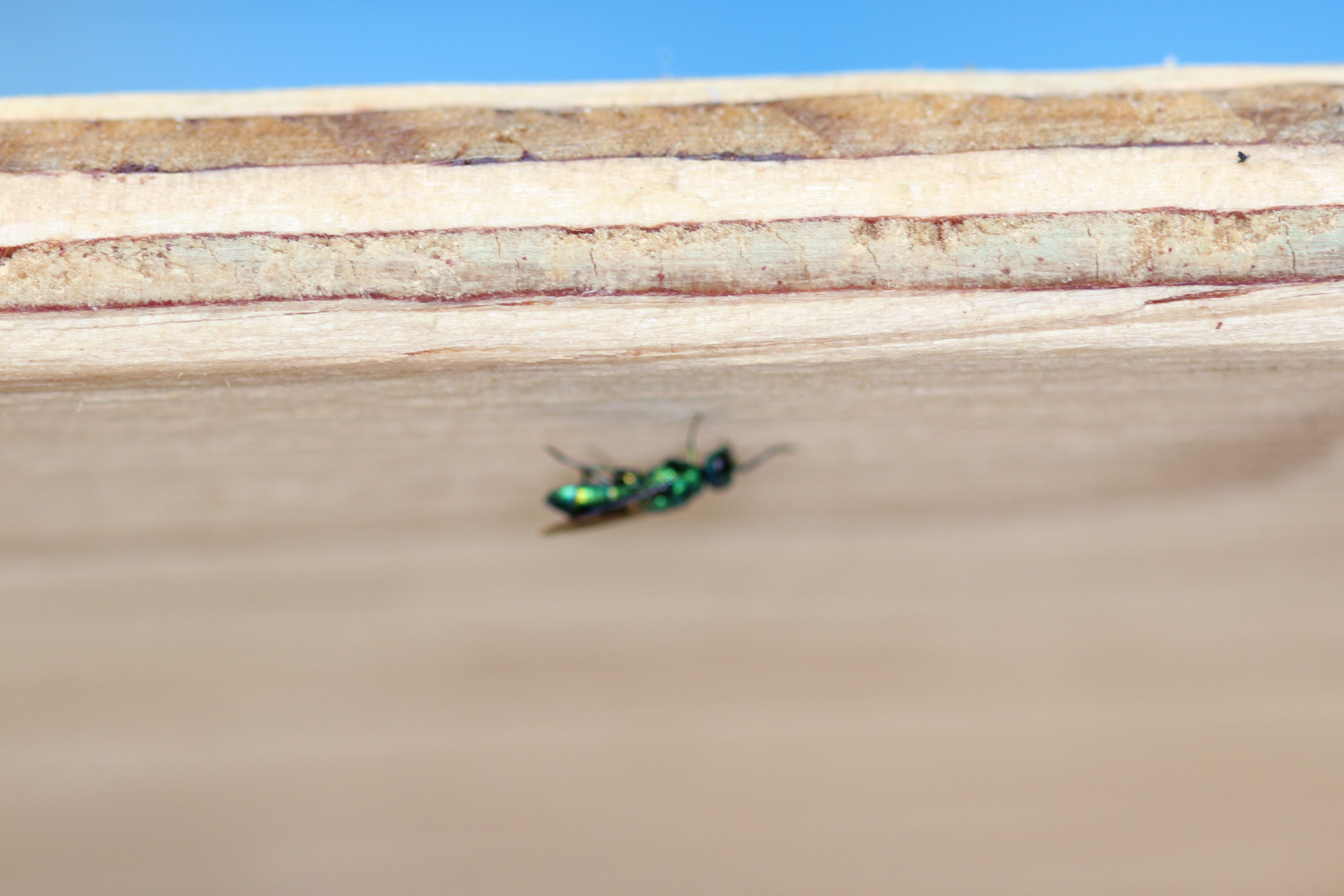 Eine metallisch grüne Goldwespe erscheint, bevor ich sie heranzoomen kann...
