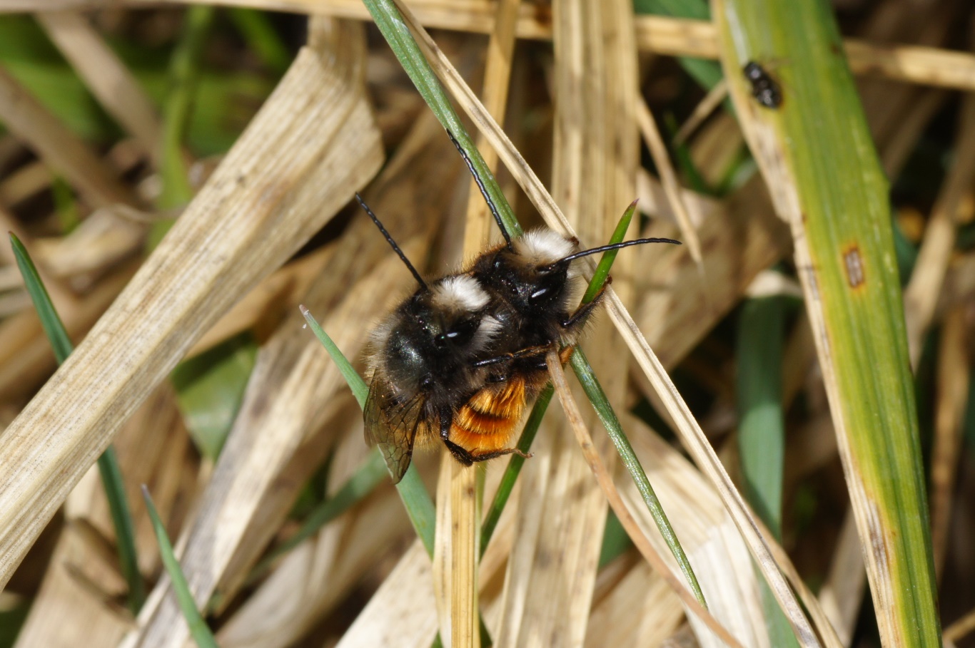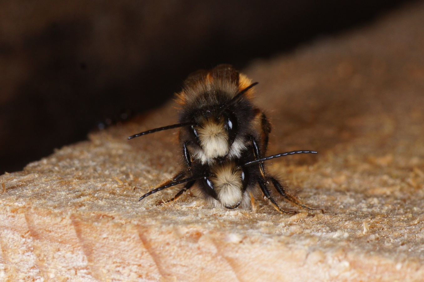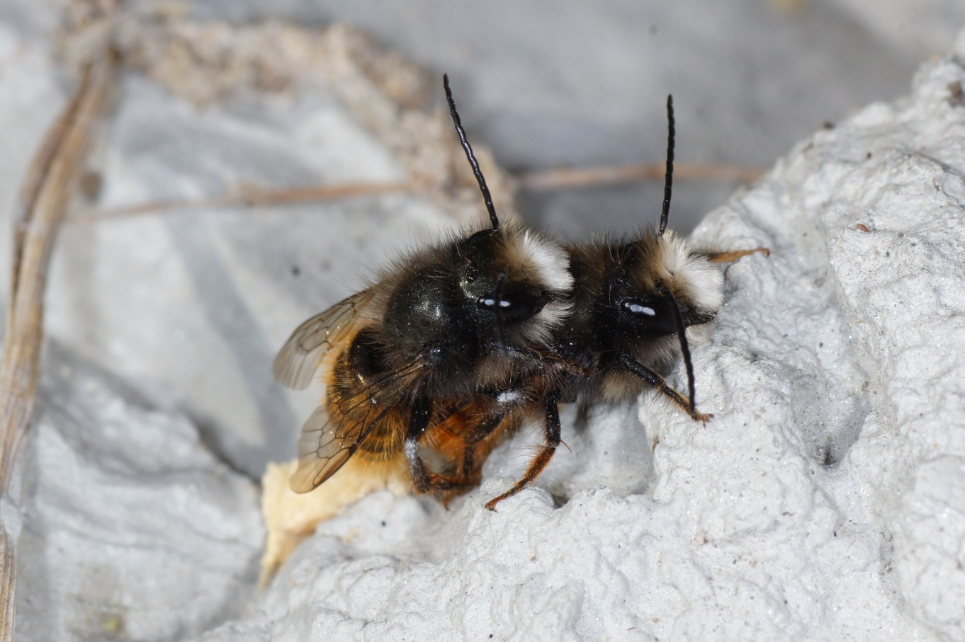 Ich zweifle etwas darann, dass es sich bei einer der Bienen auf deinem Foto um eine Weibchen handelt: In der Literatur wird die weisse Gesichtsbehaarung als sicheres Merkmal aufgeführt. Und meinen Beobachtungen zufolge unterscheiden sich die Weibchen recht sicher dadurch und sie sind in der Regel auch grösser. Wobei natürlich auch die Männchen stark in der Grösse varrieren. Jedenfalls wär mir noch nie ein Weibchen mit weissem Gesichtshaar bei der Versorgung eines Stollens aufgefallen. Könnte es nicht einen anderen Grund für die Paarbildung geben? Eine Verwechlung, weil z.B. das untere Männchen nach Weibchen "riecht" , weil es zuvor zu einer Berührung kam?