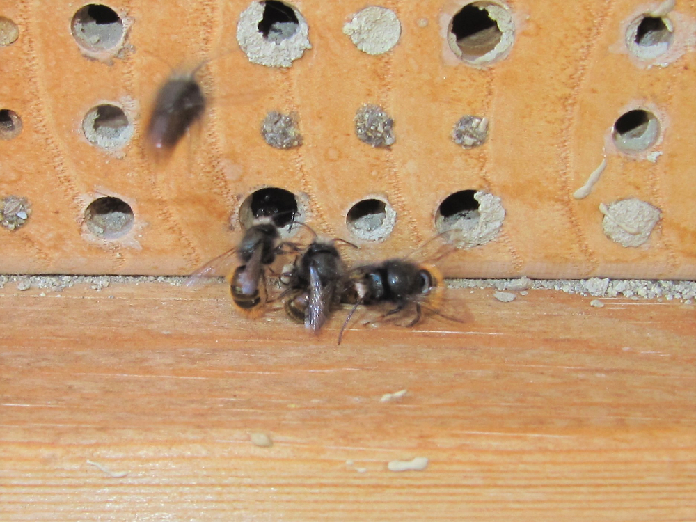 Endlich hat es geklappt! Nachdem wochenlang fast ausschließlich Männchen mein Insektenhotel unsicher machten, waren heute plötzlich gleichzeitig 2 Weibchen da! Aber diese kamen sicher nicht aus eventuell kurz zuvor geöffneten "Wohnungen", weil alle Wohungsverschlüsse bereits geöffnet waren. Die Begattung der Weibchen erfolgte augenblicklich, das Paar einschließlich etlicher "Möchtegern-Liebhaber" stürzte sofort zu Boden, wo die Begattung erfolgte. Die Beobachtung der Umklammerung habe ich nach etwa 20 Min. aufgegeben. Ich vermute, dass die langanhaltende Umklammerung weitere Männchen von einer möglichen Paarung abhalten soll. Es besteht sozusagen ein "Exklusivrecht" auf Begattung durch das erste erfolgreiche Männchen.
