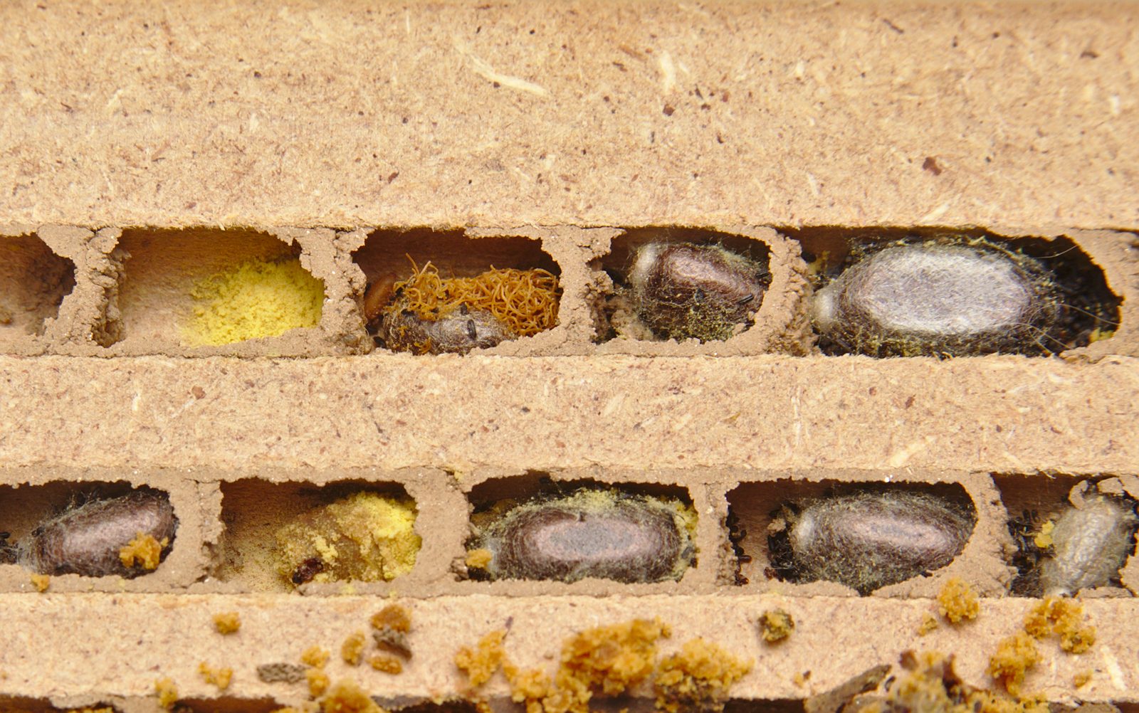 Die (scheinbare? temporäre?) Überzahl der Männchen scheint daher zu kommen, dass diese früher schlüpfen. Ich habe mal gelesen, dass die Brutzellen bei O. cornuta und O. bicornis gleich nach dem Nestverschluss immer Männchen enthalten sollen, während in den hinteren (also den zuerst angelegten) Zellen immer Weibchen vorhanden sein sollen. Das würde zu den Abläufen in meinen Beobachtungsröhrchen passen: Die älteren (hinteren) Zellen waren grösser und verfügen über mehr Pollenvorrat. Bis vor Kurzem waren in einigen Röhrchen nur die ersten Zellen aufgebrochen und leer, während in den unteren Zellen noch unverändert Puppen lagen.Ich wollte es eben fotografieren, aber nun sind bereits alle Bienen in den Beobachtungsröhrchen geschlüpft.