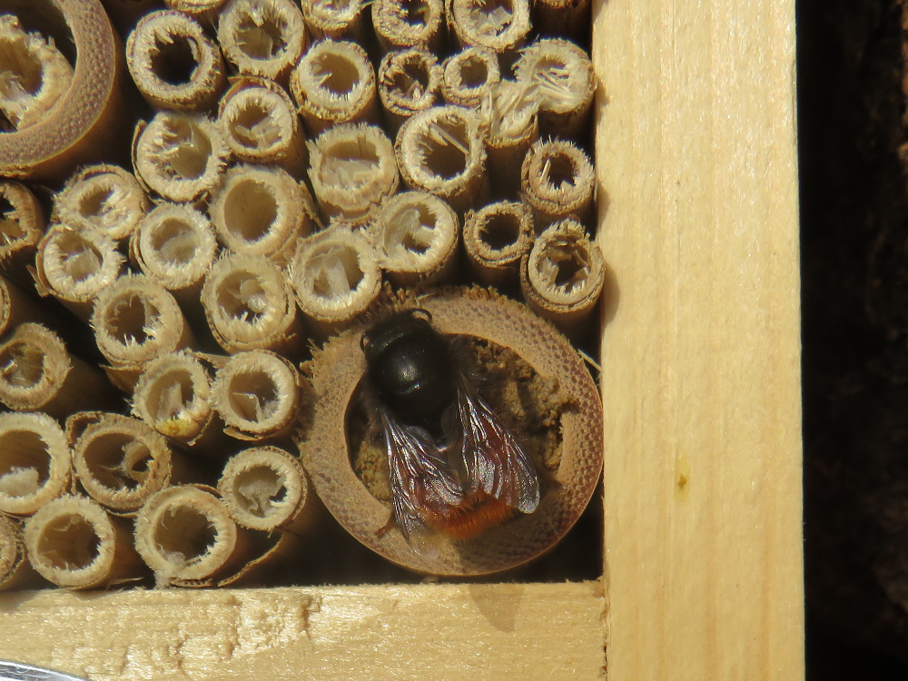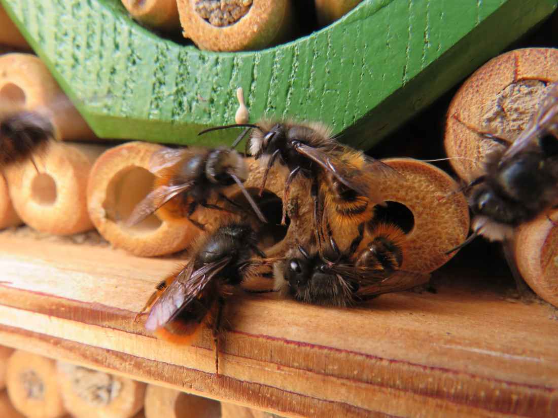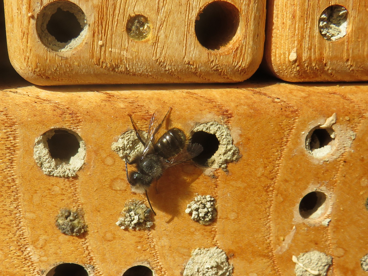 Osmia bicornis ihre Kontrollflüge aufgenommen. Weibchen der Art konnte ich noch keines beobachten. Aber die dürften auch bald aus den Stollen schlüfen.