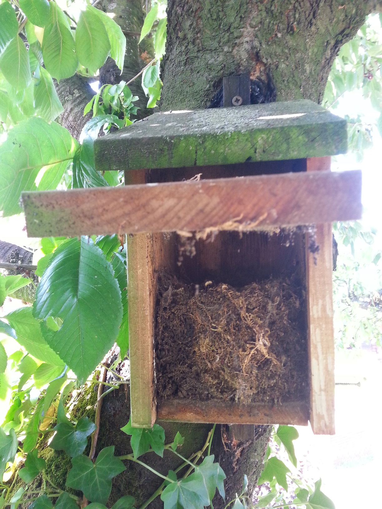 Das Nistmaterial vom Vorjahr war noch enthalten. Mittlerweile quillt der Kasten fast über.