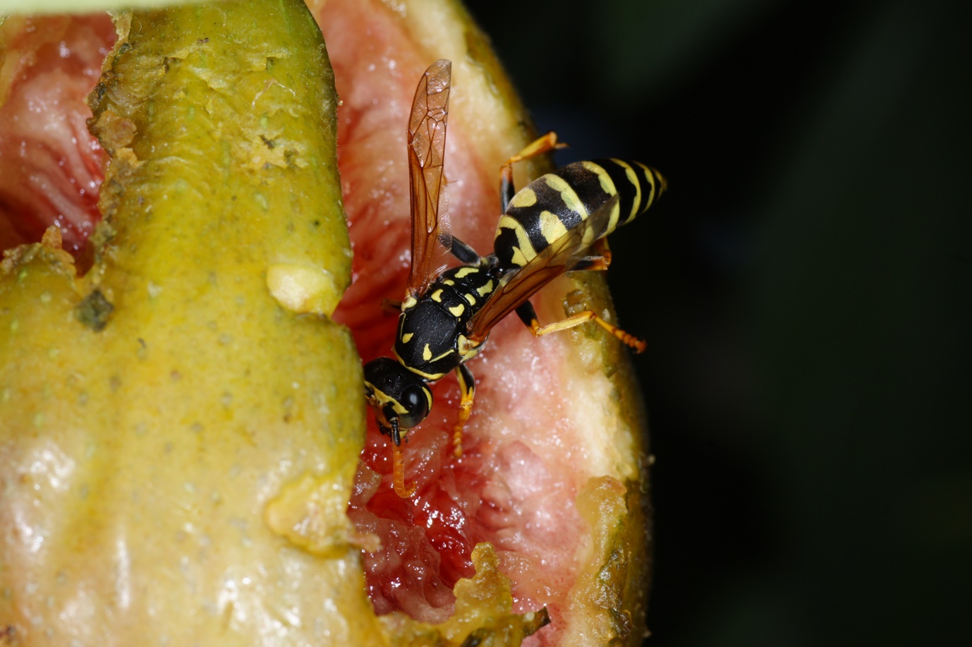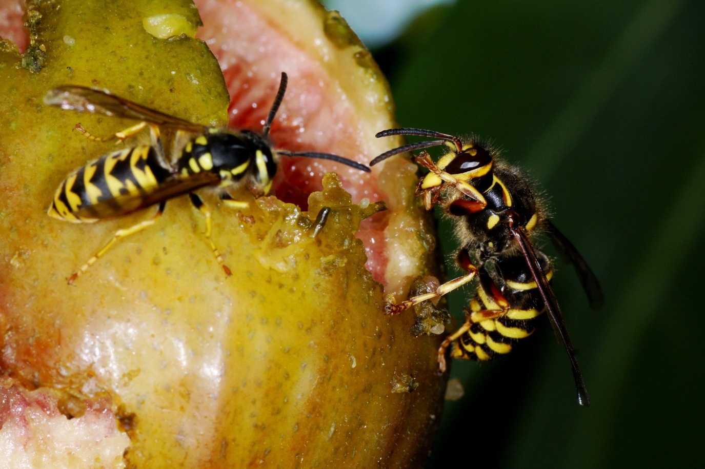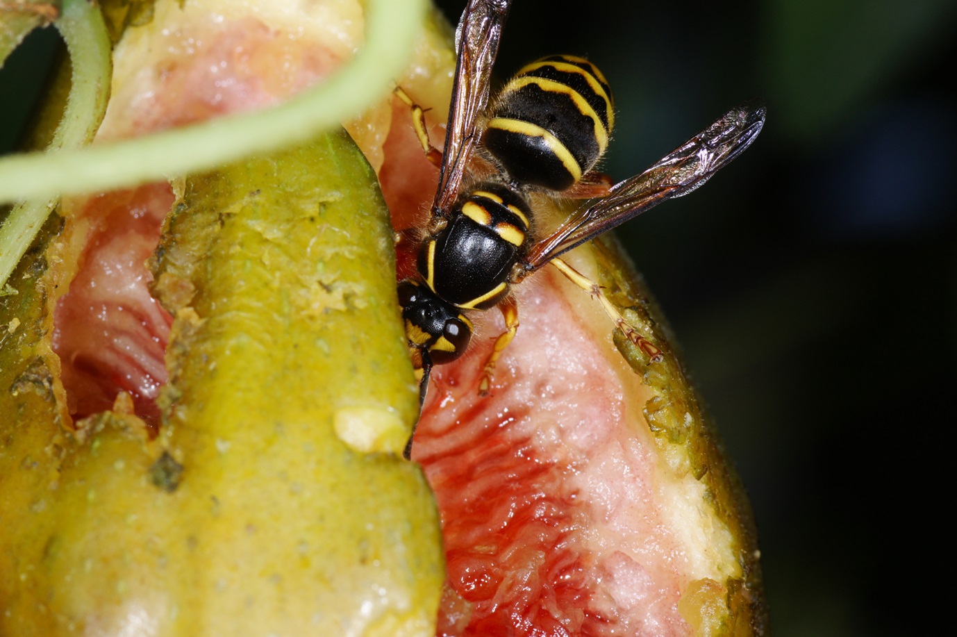Jedes Jahr das selbe: Im vorigen Jahr haben Amseln und Gartengrasmücken (!!) meine Feigenbäume abgeerntet, in diesem Jahr treten Sperlinge (!!) und Wespen in den Vordergrund. Nun, wenigstens etwas, endlich haben wir ein "Wespenjahr" und ich kann diese niedlichen Tierchen genau beobachten: Kurzkopfwespen (Vespula germanica, V. vulgaris in Massen, einzelne Vespa crabro und jede Menge Polistes dominula) und: nach vielen Jahren kann ich wieder 2 Exemplare von Vespula media (vermute ich!) beobachten, eine seltene Art, die ich viele Jahre nicht zu Gesicht bekam. Vor unzähligen Jahren hatten wir einmal ein Nest dieser Art in unserer Gartenhecke, aber die Tiere waren deutlich dunkler gefärbt. Jetzt habe ich im Internet und bei der hervorragenden Hornissen-Seite recherchiert (http://www.vespa-crabro.com/unterscheidung.htm), aber das Bildmaterial hat mich da wie dort keineswegs zufrieden gestellt: Offenbar ist die Farbgestaltung von V. media sehr unterschiedlich, vielleicht regional oder generell.