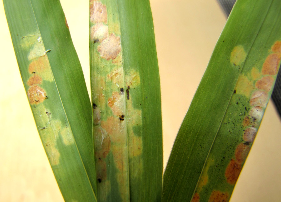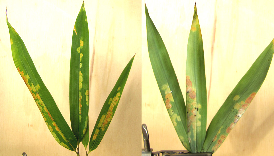 Bild 1 zeigt ein paar Blätter mit den charakteristischen Schäden, von der Oberseite (links) und von der Unterseite.
