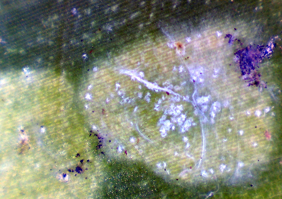 Bild 2 hebt die teilweise von einer Art Gespinst überzogenen Flecken hervor und zeigt auch kleine dunkelbraune Flecken, die anscheinend zu dem Schadbild gehören.