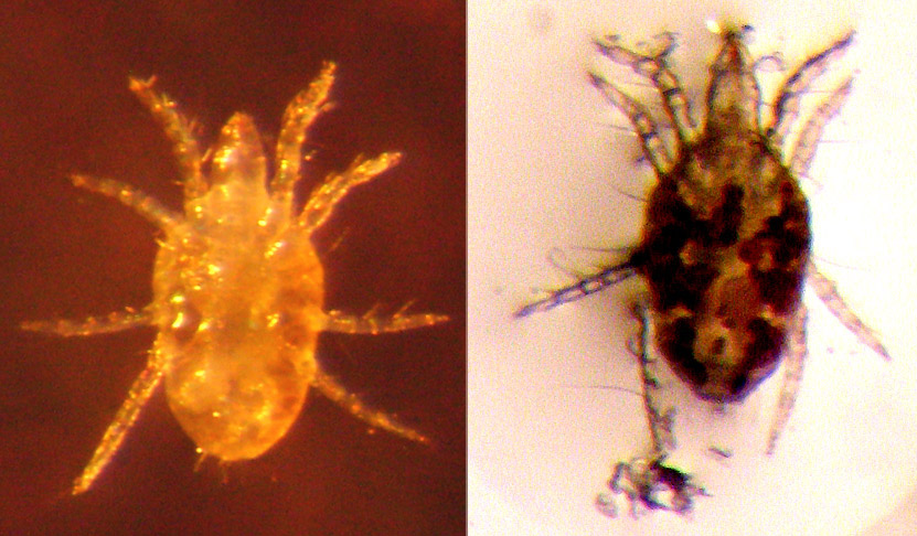 Bild 6: Es gelang, zwei der Milben durch das Präpariermikroskop zu fotografieren, links von unten, rechts von oben. Sie sind ganze 0.3 bis 0.34 mm lang, ein Drittel eines Millimeters!
