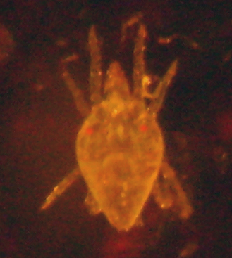 Bild 6: Nur bei bestimmten Lichtbedingungen sind die zwei leuchtend roten Augen der Milbe darzustellen.