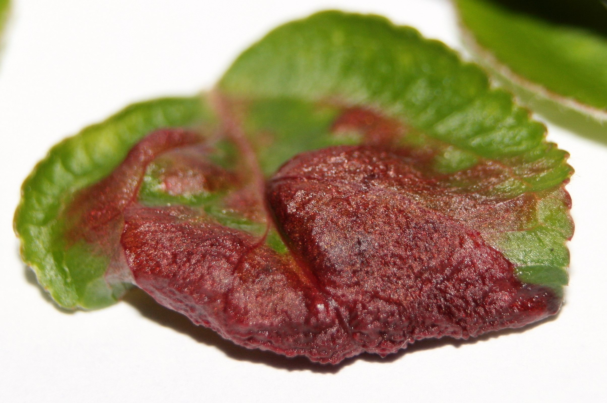 Ich hab hier mal ein paar Bilder von den Blättern unseres jungen Apfelbäumchens. Diese sind auffalend rot und zusammengekräuselt.