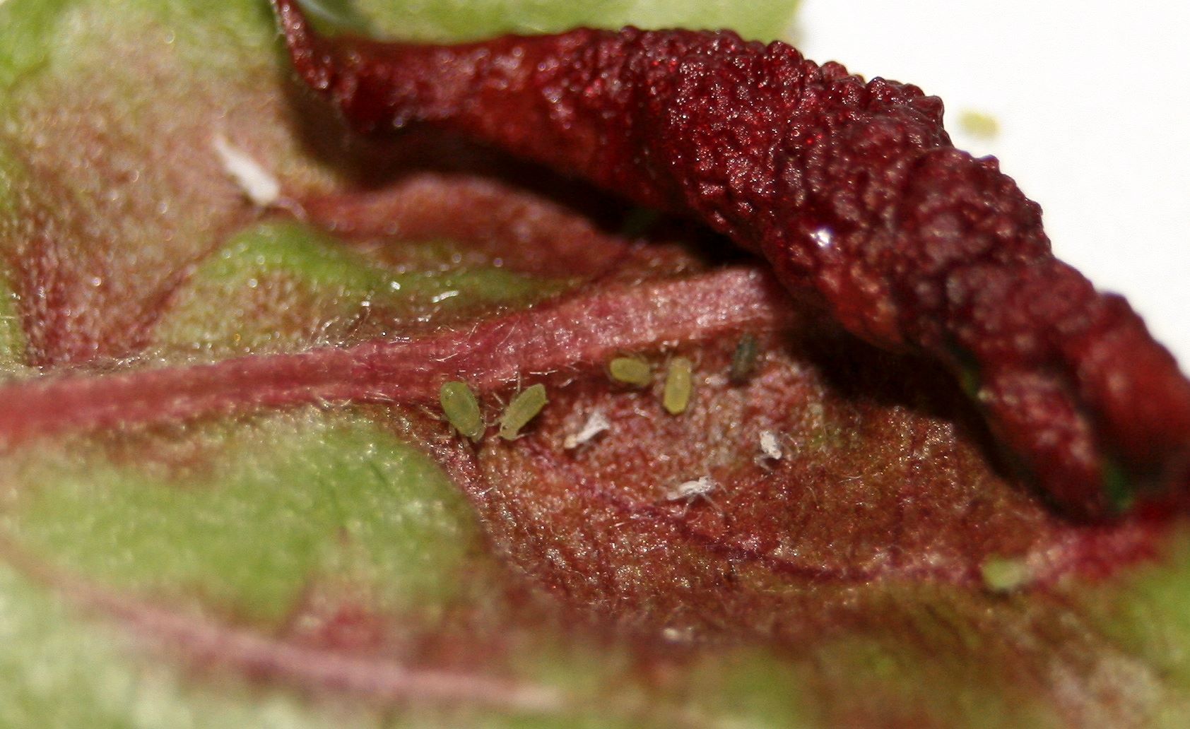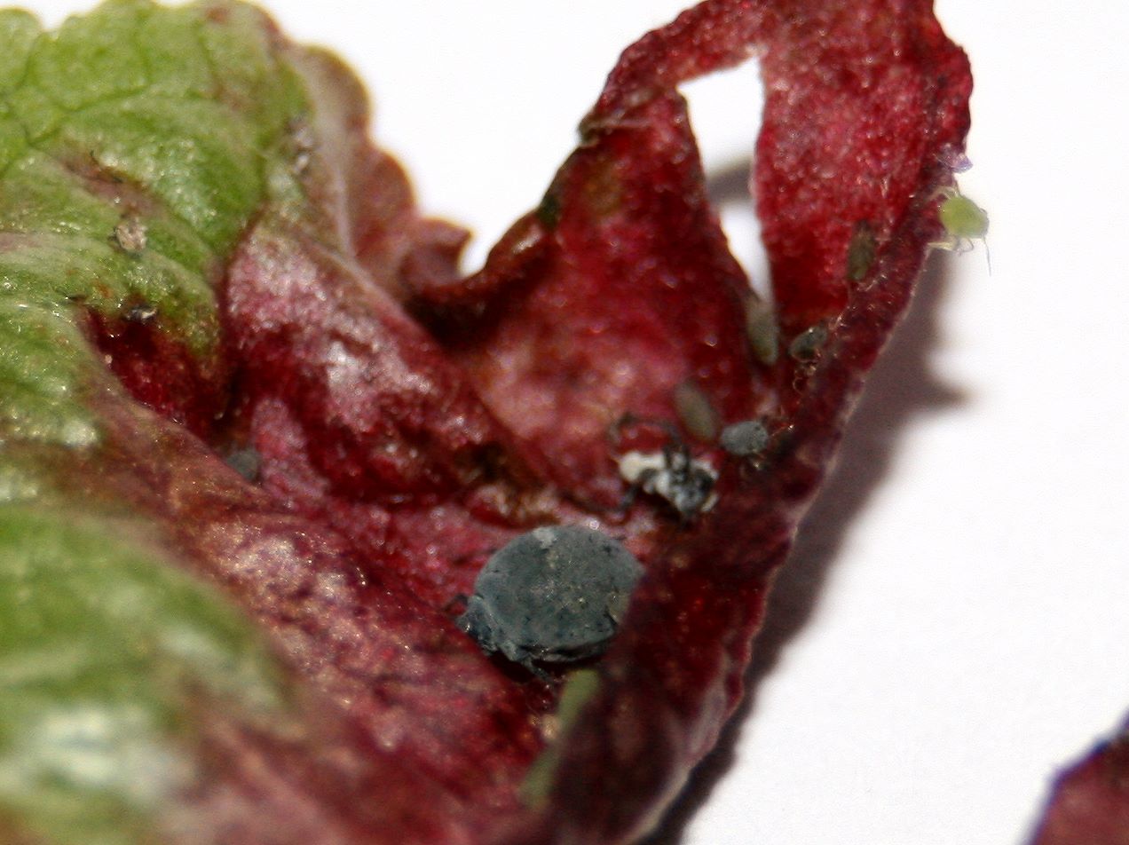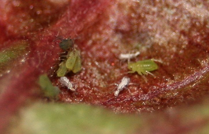 Ich hab mir noch mal die Bilder angesehen und konnte neben den grauen und grünen Blattläusen noch kleinere, irgendwie eher spinnenartige, weiße Tierchen erkennen.