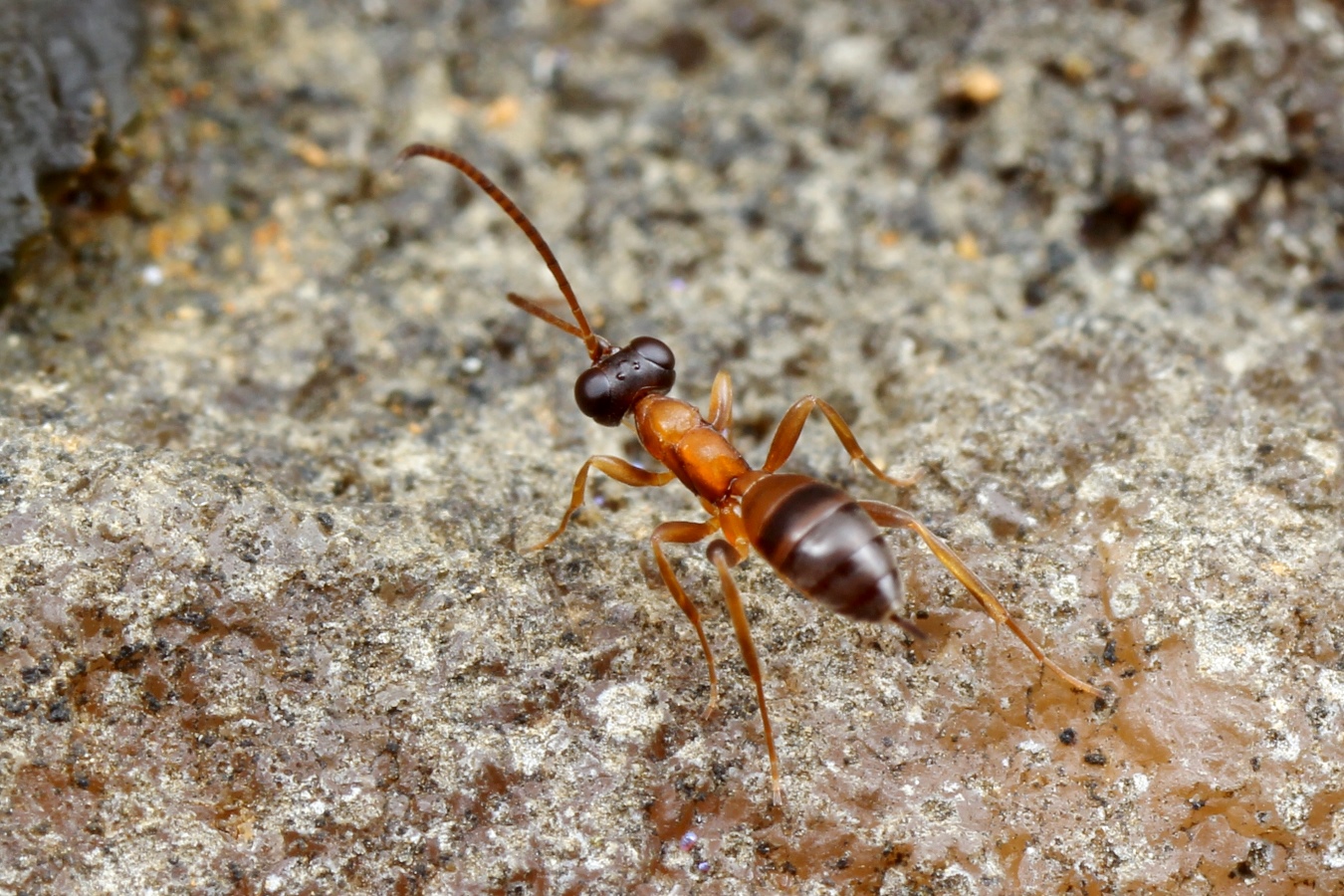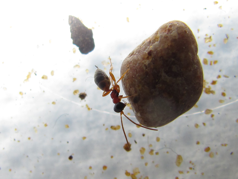 Der Legestachel fällt von weitem nicht auf, nur die Antennen und die Wartepausen die es auf seinem Weg macht, verraten, dass es keine Ameise sein kann.