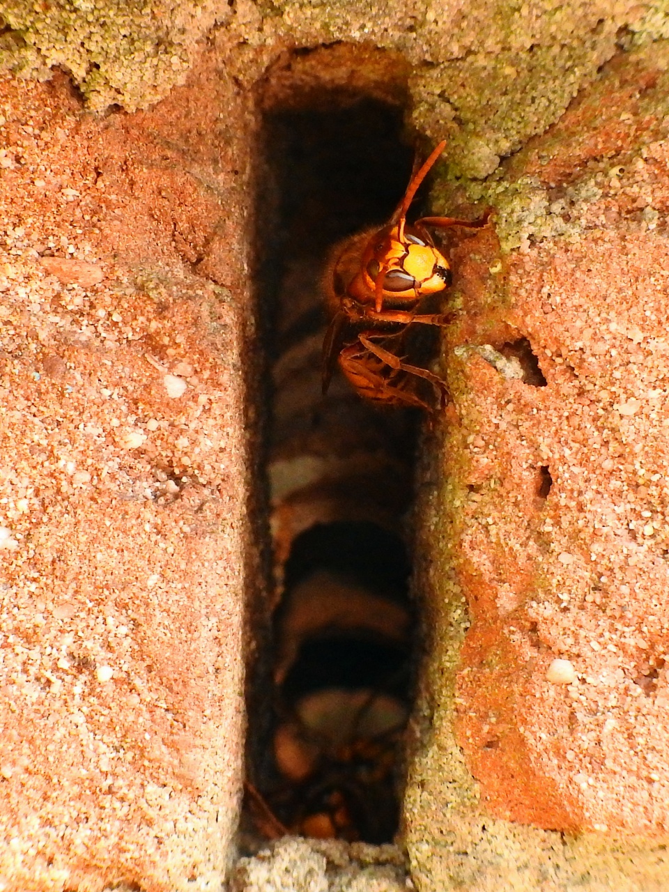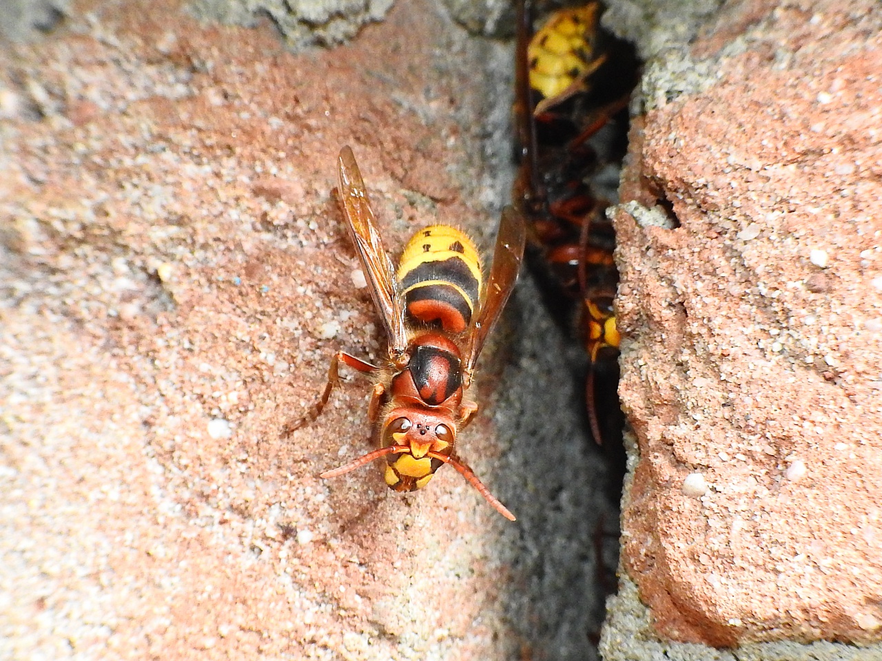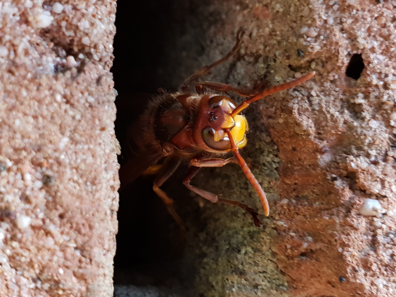 In der Fassade des Gebäudes beobachte ich schon seit einiger Zeit ein Hornissenvolk (Vespa crabro). Die großen kleinen haben sich die fehlende Abdeckung von einem Lüftungsschlitz, des zweischaligen Mauerwerks, zugute gemacht und sitzen mit ihrem Bau wohl in der Dämmung der Wand.