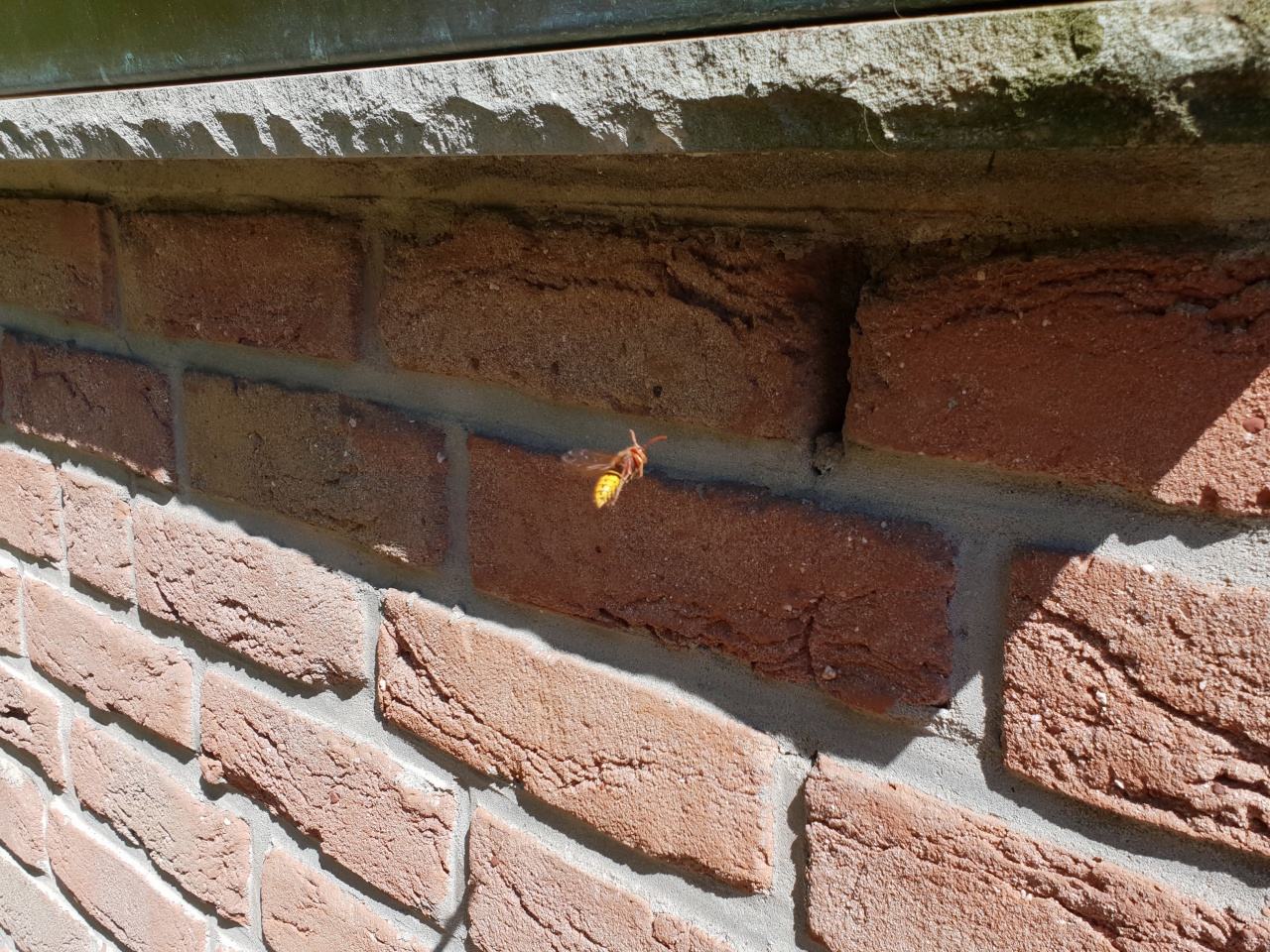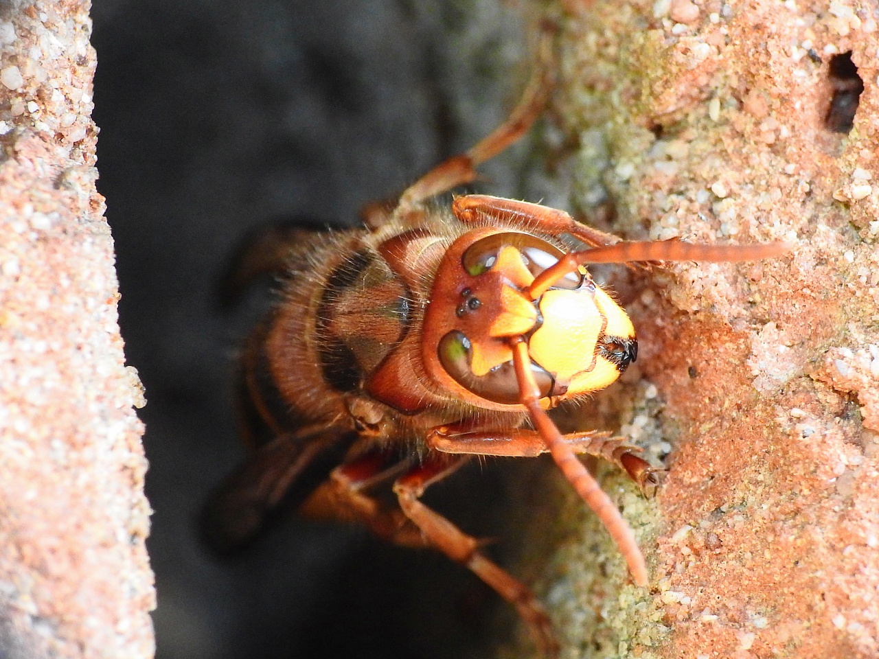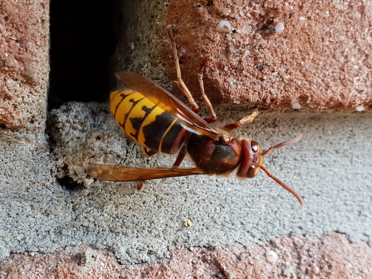 In der Fassade des Gebäudes beobachte ich schon seit einiger Zeit ein Hornissenvolk (Vespa crabro). Die großen kleinen haben sich die fehlende Abdeckung von einem Lüftungsschlitz, des zweischaligen Mauerwerks, zugute gemacht und sitzen mit ihrem Bau wohl in der Dämmung der Wand.