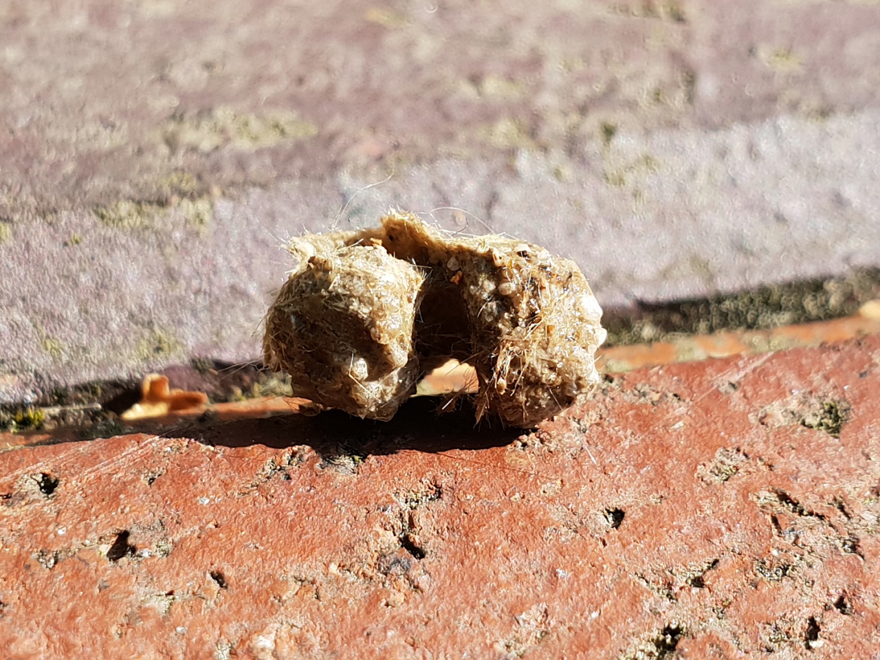 Meistens wurden nur kleine Stücke Dämmmaterial heraus getragen, aber eine Arbeiterin schleppte diesen Brocken aus dem Nest. Er war recht fest und ließ sich nur mit Kraft zerbröseln, ich dachte erst an Putzreste aber die Fasern darin deuten eher auf Exkremente hin oder? Die Hornisse die diesen Brocken trug, schaffte es jedenfalls nicht richtig damit zu fliegen und plumpste quasi schon nach ca. zwei Meter zu Boden.
