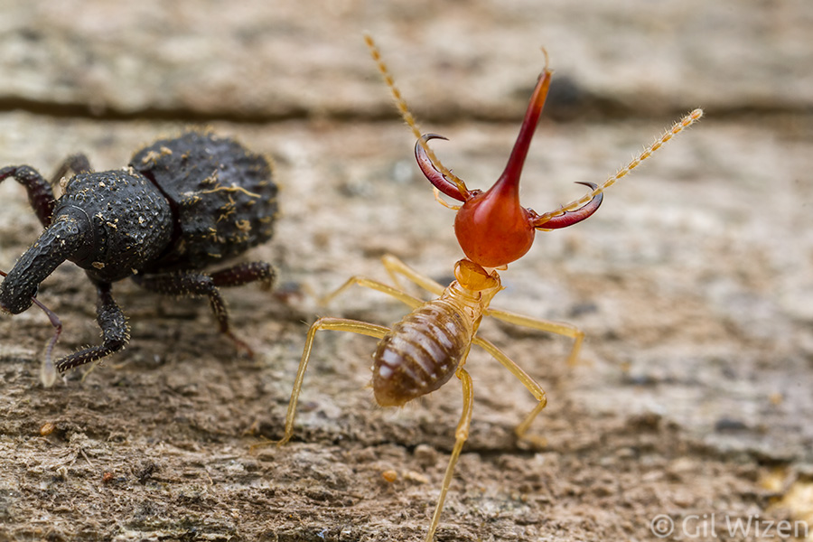 Even tough beetles like this weevil know to steer clear of active Rhynchotermes perarmatus soldiers. Selbst hart gepanzerte Käfer wie dieser Rüsselkäfer gehen R. perarmatus-Soldaten aus dem Weg. (aus dem genannten Blog)