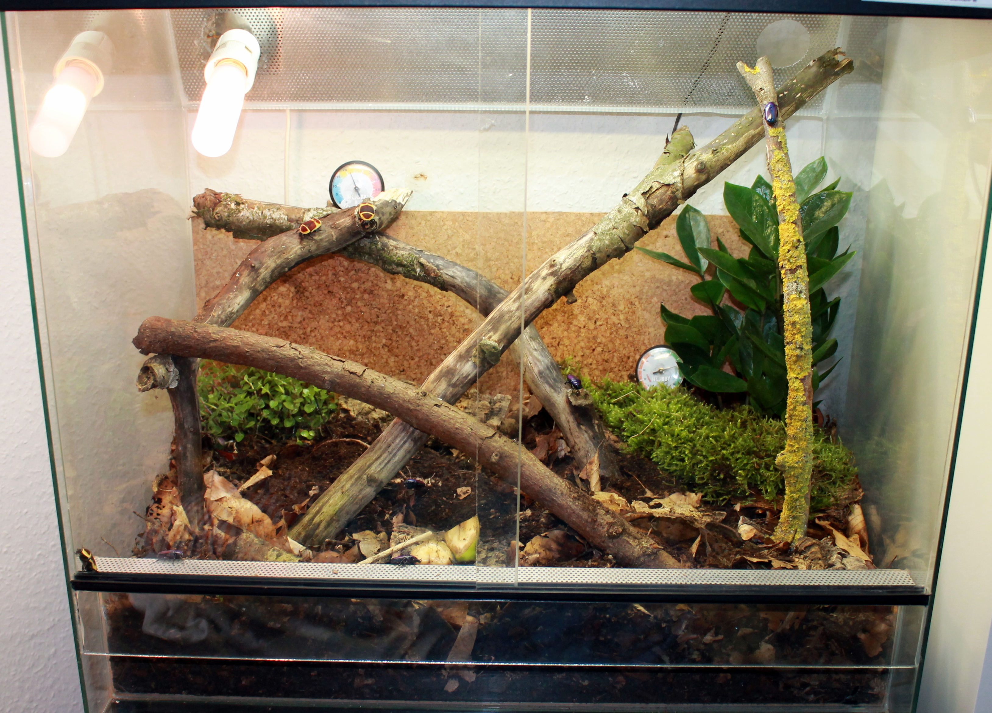 Da die Käfer und vor allem ihre Larven natürlich das gesamte Substrat (Laubwaldhumus und weißfaules Holz) umgraben, sieht es mittlerweile nicht mehr so ordentlich auch. Der Substratwechsel tut sein übriges.