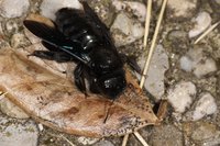 Über die imposanten Holzbienen hatte ich schon im alten AF 2011 berichtet, dort sind aber leider die Bilder verschwunden. Ich fand damals eine Holzbiene am Boden sitzend und ich dachte es gehe mit ihr zu Ende. Da diese Insekten hervorragende Flieger sind und auf die Annäherung des Menschen sofort mit Flucht reagieren, holte ich rasch meine Kamera. Es dürfte sich um Xylocopa violacea handeln, zu verwechseln wäre sie mit Xylocopa valga. Eine dritte Art kommt (bisher) in Mitteleuropa vor: Xylocopa iris, die angeblich von den beiden zuerst genannten Arten leichter zu unterscheiden ist. Die Insekten werden bis etwa 2 cm lang, hier handelt es sich um ein Weibchen.