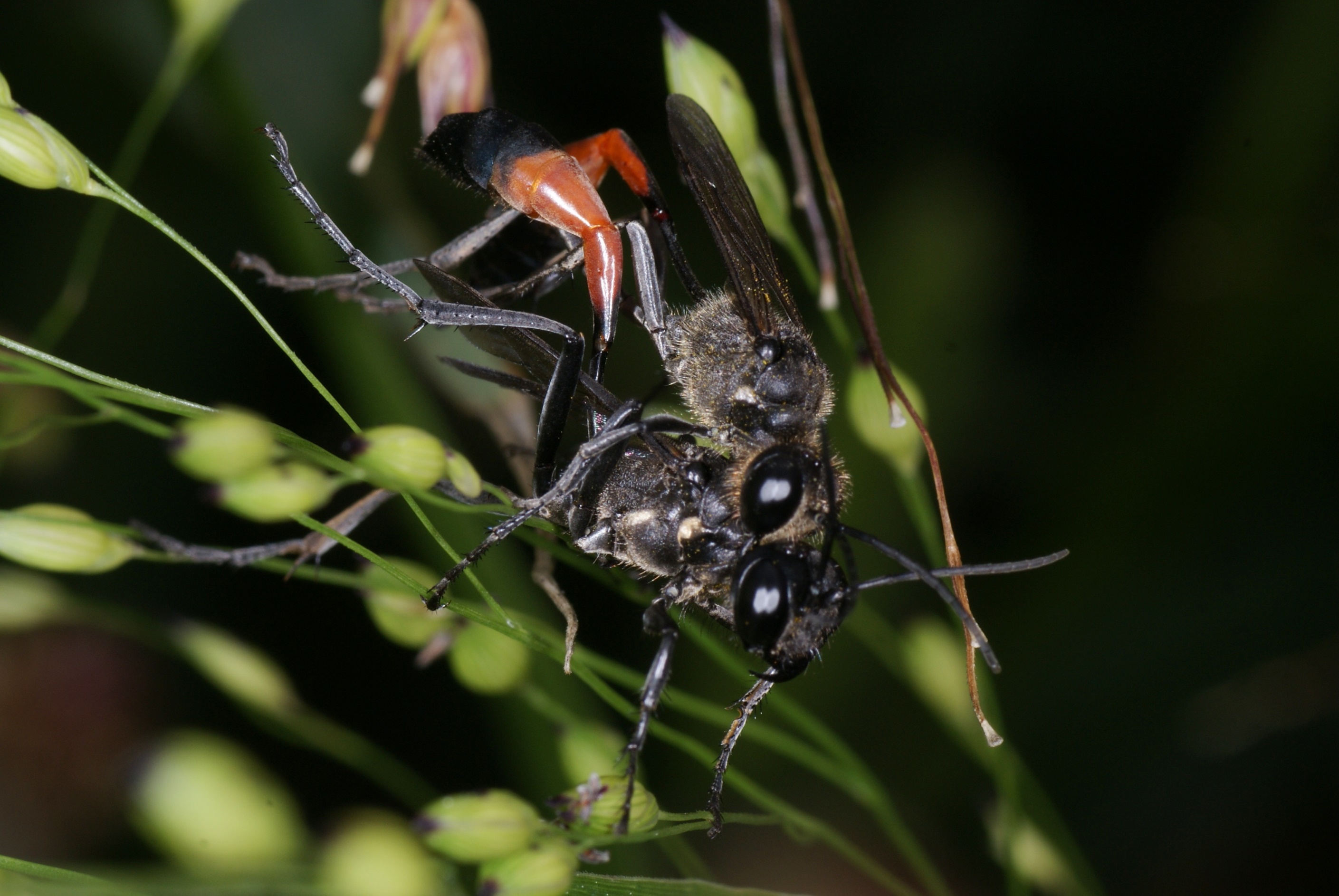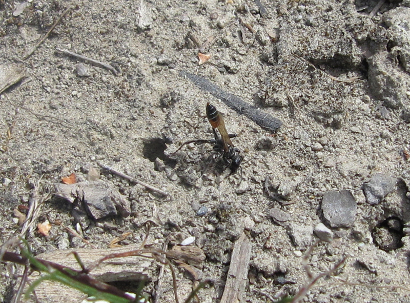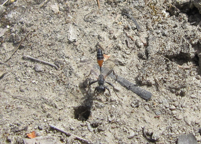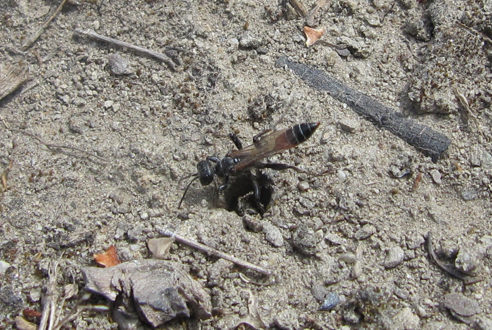 Bild 5. [Die müsste doch einfach zu bestimmen sein. Schwarze Wespe mit schwarzen Flügeln! Aber keine Ahnung!] Inzwischen bekannt: Isodontia mexicana
