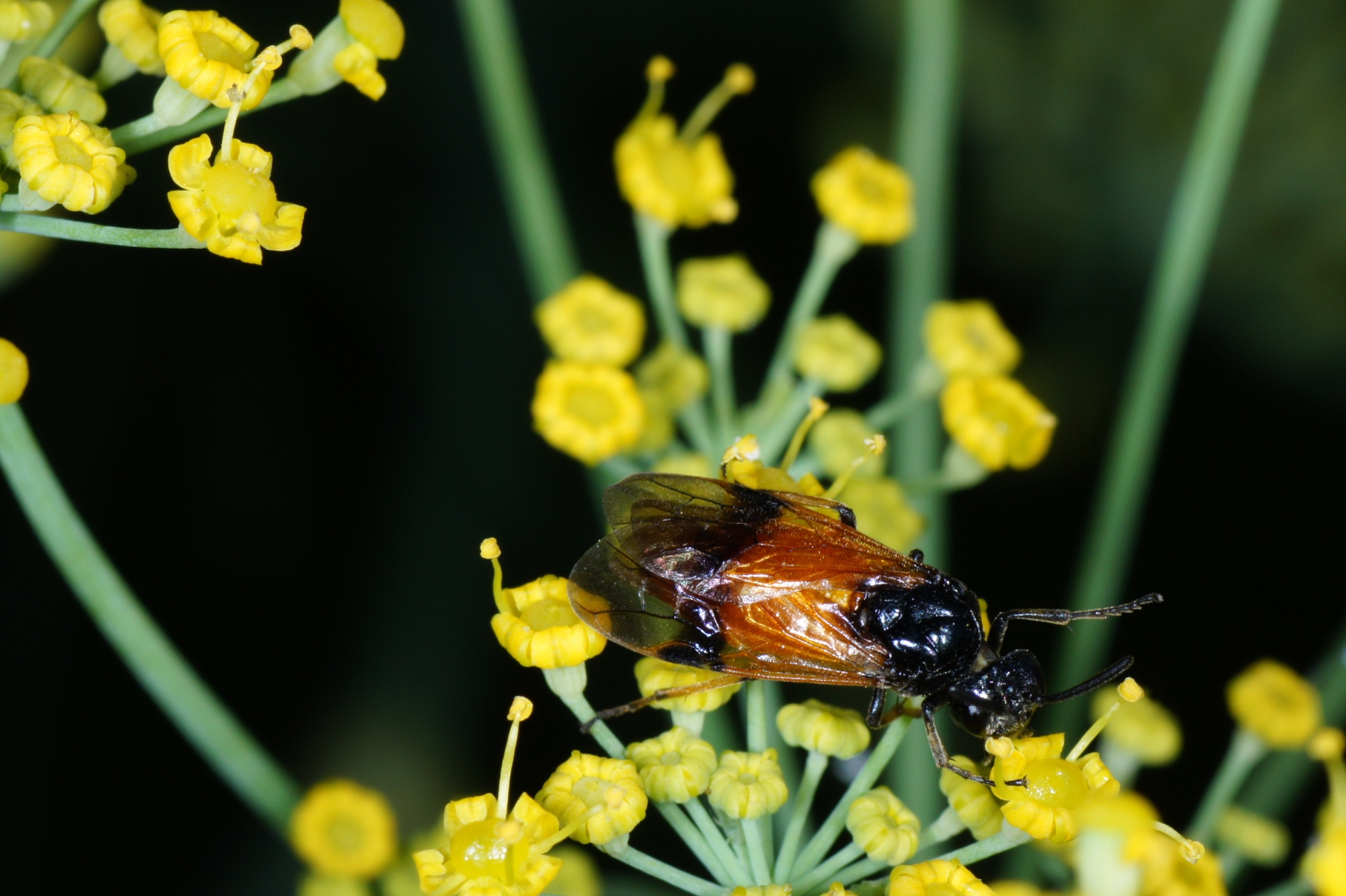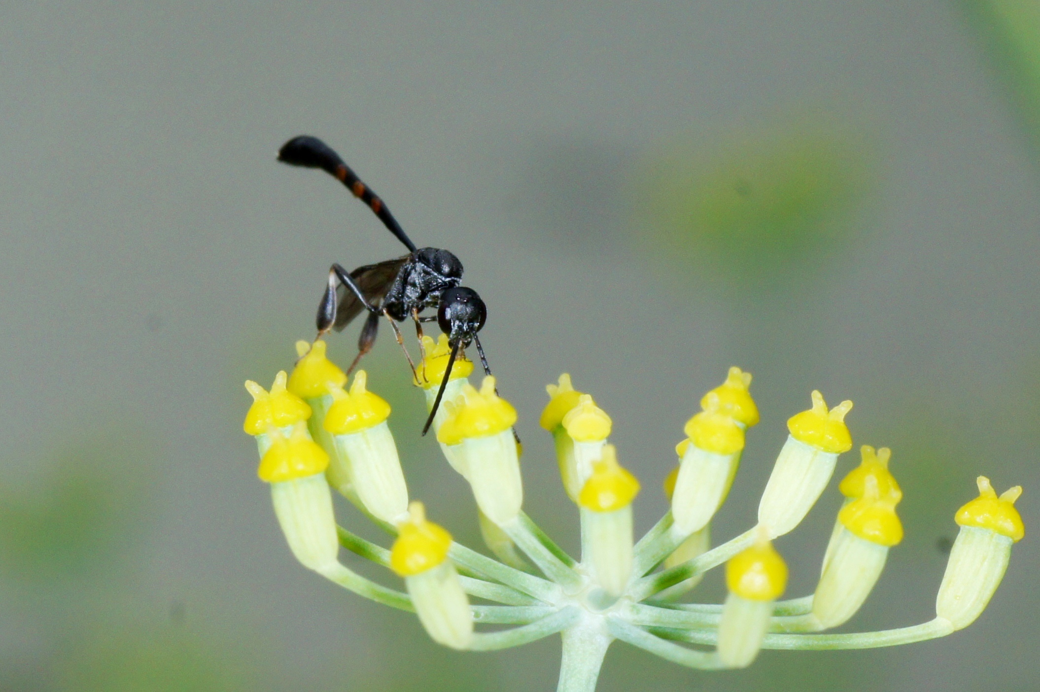 Ich hoffe du bist nicht ungehalten, dass ich mich gleich mit ein paar Fotos von solitären Wespen (außer Polistes) anhänge. Komisch, niemand hat einen riesigen Fenchel im Garten, ein richtiger Blickfang, noch dazu duftend und 2,5 m hoch werdend; übrigens jedes Jahr wieder austreibend! Diese blühende Pflanze zieht unzählige Insekten, vor allem solitäre Wespen und Bienen an. Oft sind es 1 bis 2 Dutzend verschiedene Arten gleichzeitig!