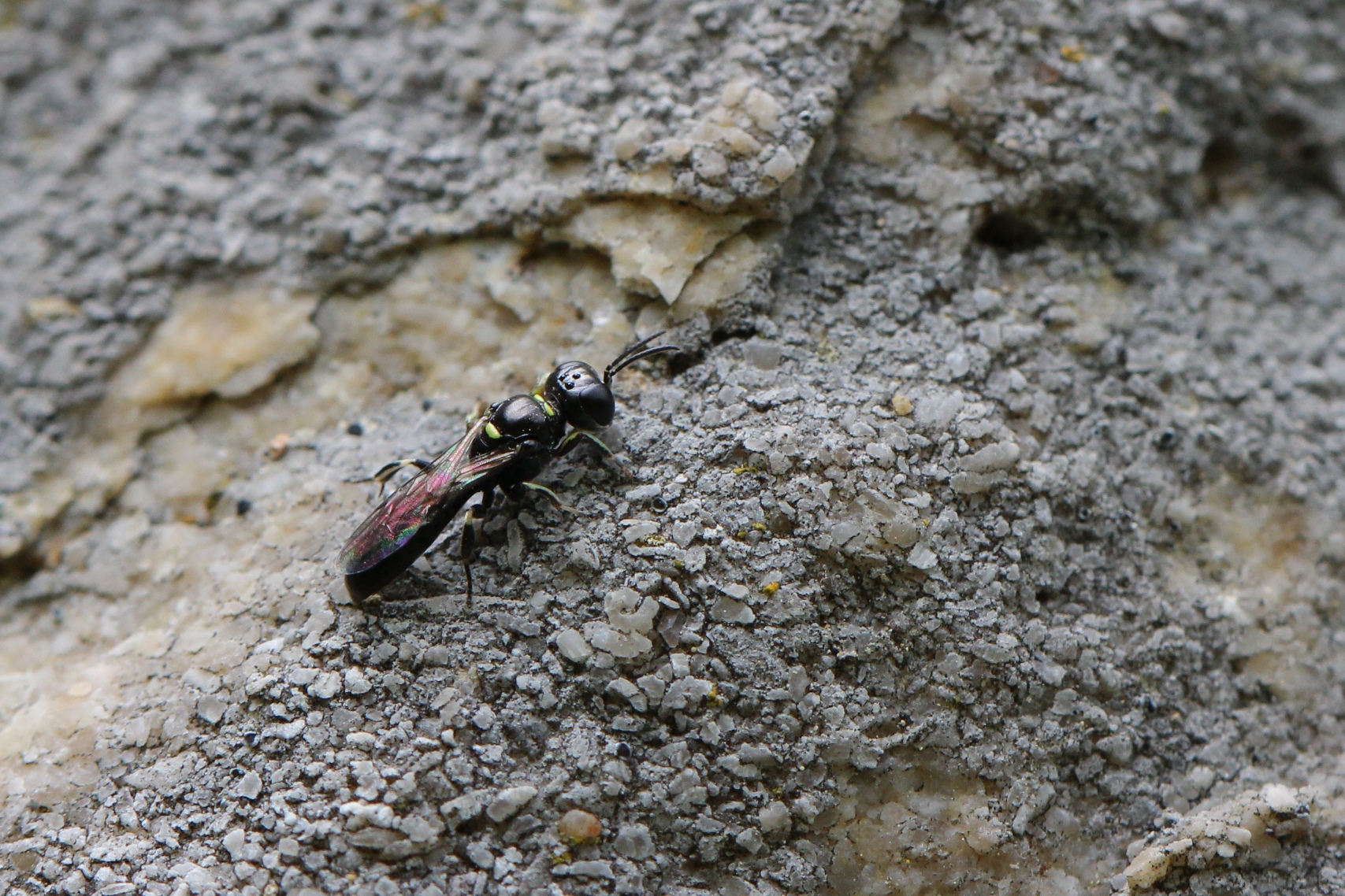 Bild 4., würde ich meinen es könnte sich, wegen den unauffälligen gelben Zeichnungen um eine Maskenbiene Hylaeus sp. handeln, die ja als „Urbiene“ stark an Grabwespen erinnert. Oder eben doch eine kleine Grab- oder Rollwespe? http://www.bwars.com/index.php?q=catego ... hyalinatus