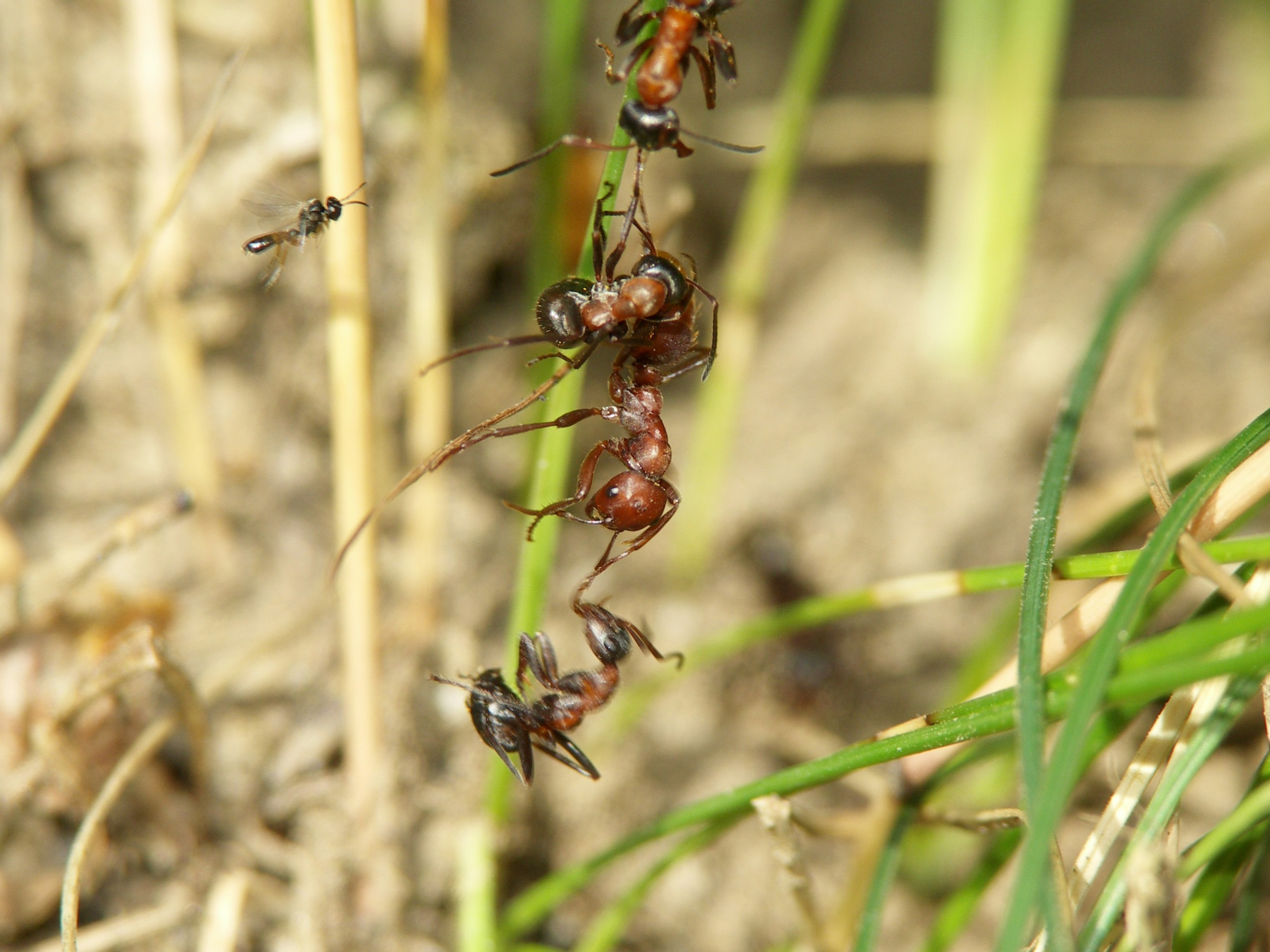 Kampf zw. Polyergus und den Verteidigern (wieder F. rufibarbis). Die Not der ineinander verbissenen Individuen macht sich eine Wespe zu Nutzen!