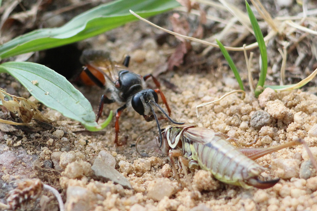 Heuschreckensandwespe mit gelähmter männlicher Langflügeliger Schwertschrecke für den Nachwuchs