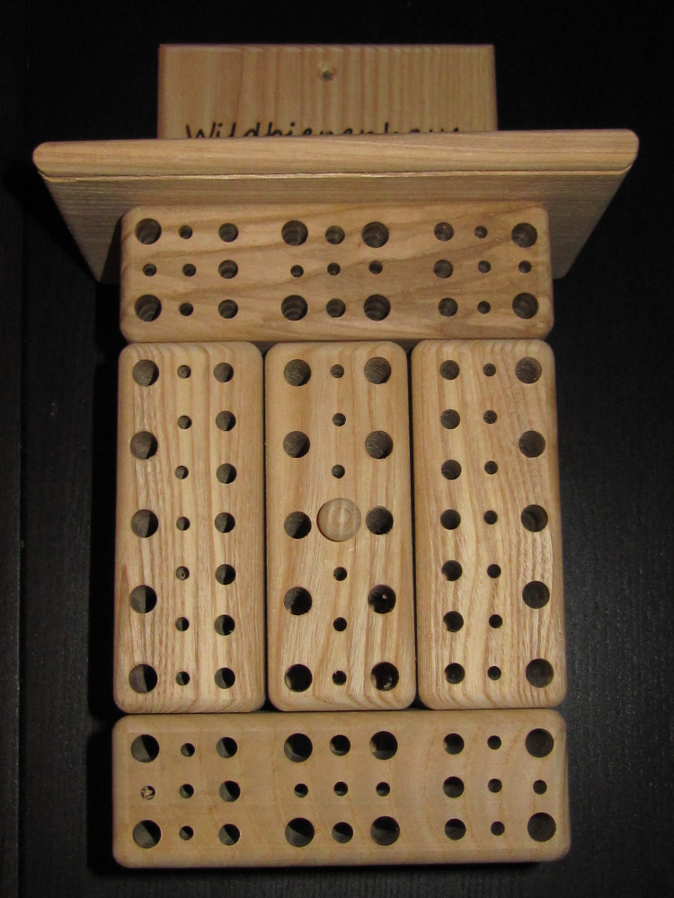 Faul wie ich bin, habe ich mir allerdings ein robustes, kleines „Wildbienenhaus“ vom Profi anfertigen lassen. Überzeugt hat mich der „Beobachtungsauzug“ mit Plexigalsscheibe, der mir Einblick in einige der Bohrlöcher gewährt und mir die Betrachtung der Brutzellen ermöglichen soll - falls sich den einige Wildbienen oder solitäre Wespen dazu entschliessen, das Nistplatzangebot anzunehmen.