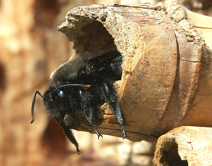 Bewohnt wird das Ganze vor allem von Mauerbienen (Osmia cornuta) und von der Holzbiene Xylocopa violacea. Aber auch kleinere Bienenarten sind vorhanden, und zeitweise nisteten Temnothorax affinis und Leptothorax acervorum in den Hölzern, alles von alleine zugeflogen! ;)