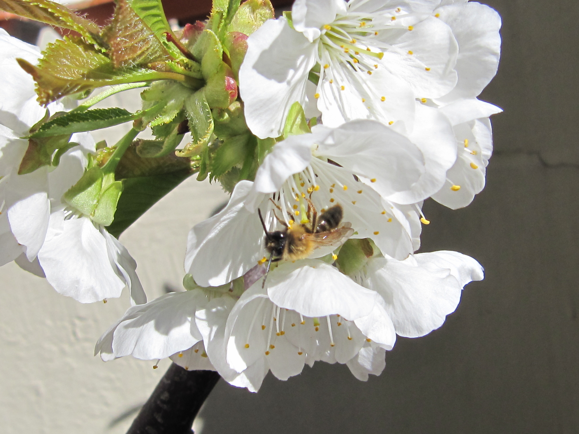 Kleiner Zwischenbericht: Die Tracht auf dem Balkon stösst, jetzt wo Witterung und Temperatur besser werden, auf Interesse. Einige Honig- und Wildbienen (kann jemand die Art bestimmen?) besuchen z.B. aktuell gerade das blühende Kirschbäumchen, ab und zu fliegt sogar eine Hummelkönigin an.
