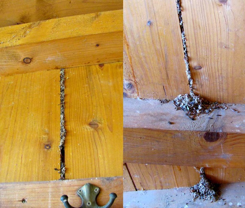 Im Inneren wirkt das Holz noch sehr gut erhalten. Auch die Bretter auf der Außenseite, die so angeordnet sind, dass sie die inneren Fugen überlappen, sind gut erhalten. Doch zeigen die Bilder der Innenseite in den Fugen zwischen den Brettern eigenartige „Ausfüllungen“, von der Decke bis zum Boden. Auf Querbalken sammelt sich das „Gemüll“ zu kegelförmigen Häufchen.