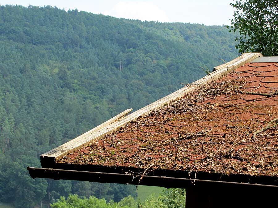 Der Blick von vorn-unten auf die talseitige Dachkante offenbart ein Bild der Verwüstung!