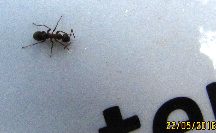 Hier krabbelt eine Formica (Serviformica sp.) unter der Folie eines Hinweisschildes.
