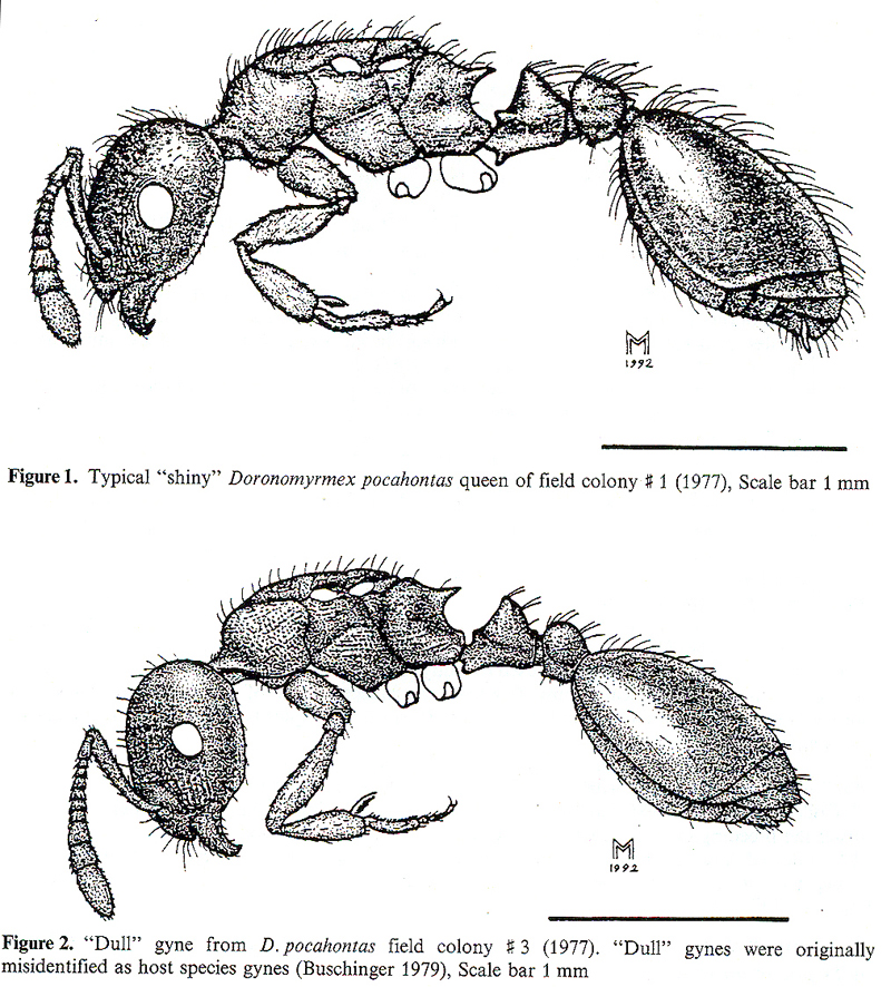 In den folgenden Jahren kamen dann Bedenken auf, vor allem darüber, ob die Art wirklich ein arbeiterinloser Parasit ist. Ich selbst habe sie im Labor über ein paar Generationen gezüchtet, es entstanden Arbeiterinnen (!), und Gynen, die zum Teil der typischen Form entsprachen, teilweise aber auch denen der vermeintlichen Wirtsart ähnlich sahen, aber doch nicht gleich waren. Kollegen aus Kanada und aus Deutschland nahmen sich der Sache an; die Gattung Doronomyrmex wurde aufgegeben, so dass pocahontas ebenso wie die europäische D. pacis in die Gattung Leptothorax kam. Doch bis heute blieb es unklar, was es mit der langhaarigen Schönheit aus dem Jasper-NP auf sich hat. Ist es wirklich eine „gute Art“, ein Sozialparasit, oder doch eine selbständige Art, die gelegentlich und unter bestimmten Umständen die auffallenden Gynen erzeugt, ein Polymorphismus? Produkt einer Hybridisierung zweier dort vorkommender Arten? – Es wäre an der Zeit für eine genetische Untersuchung!