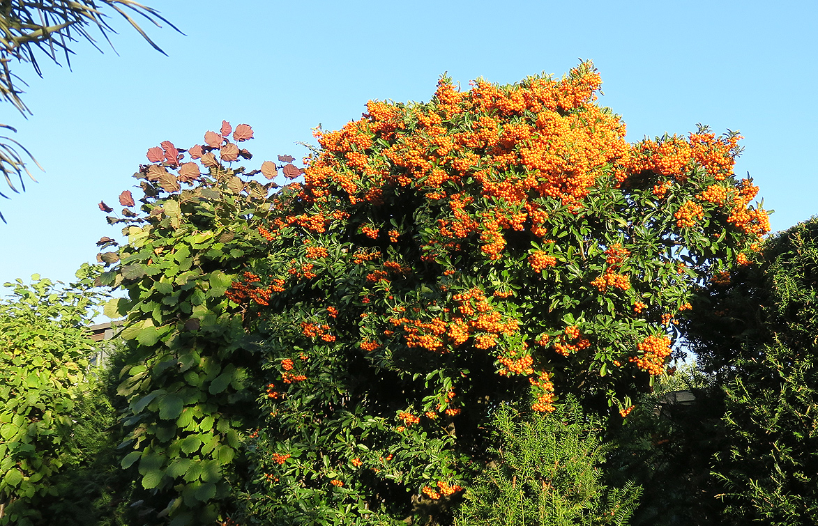 Der Feuerdorn hat gelbe oder rote "Beeren". Hier in meinem Garten.