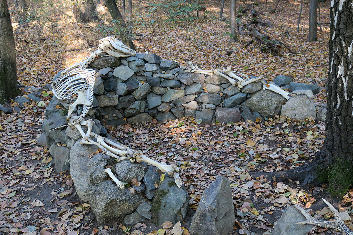 Die Mauer jedenfalls sieht recht locker aus, und das Tier ist sicherlich nicht in dieser Position gestorben, sondern wurde dort sorgfältig hingelegt. Sieht alles sehr skurril aus, auch das Geweih unten rechts im Bild.