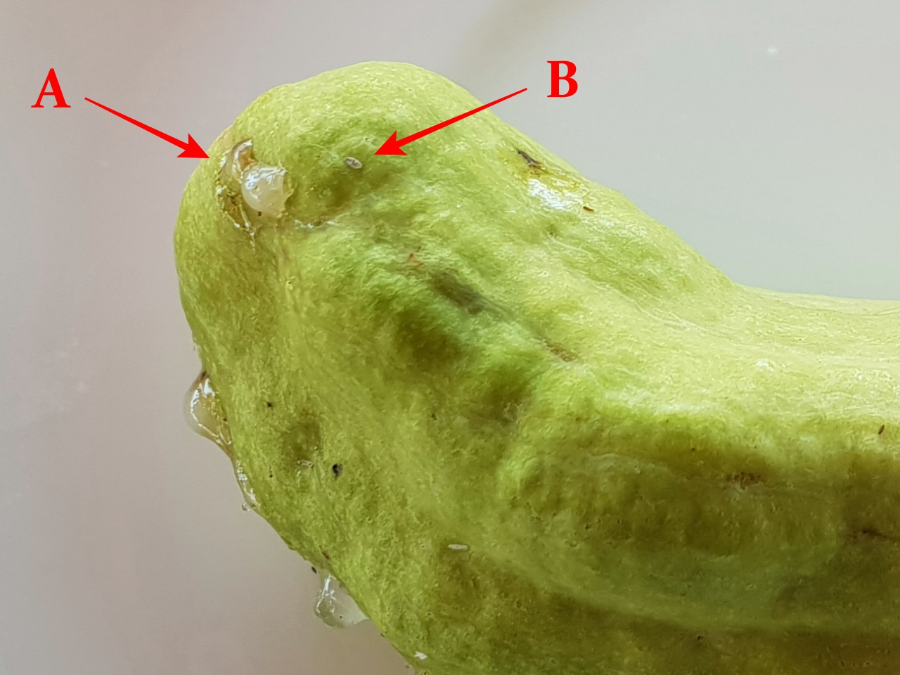 Ich habe hier einen Ausschnit vom Originalbild. Die schleimigen Austritte (A) haben jedenfalls keine Beinchen oder meinst du das kleinere Etwas (B) aber auch da kann ich beim besten Willen keine Beinchen erkennen?