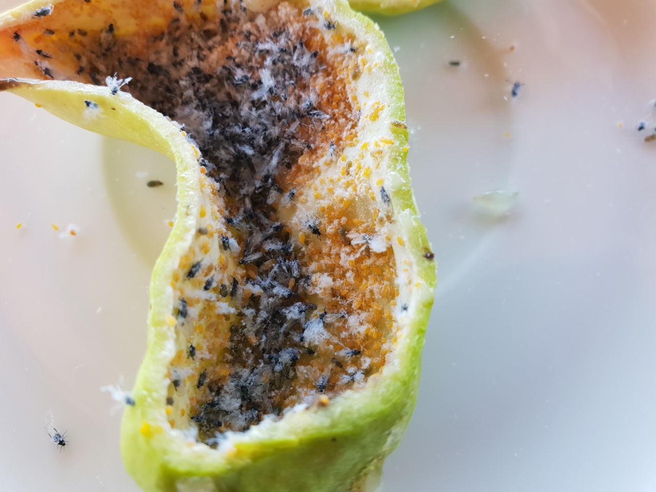 Daran sehe ich winzige transparente Objekte, links oben scheinbar (?) mit Beinchen. Junge Blattläuse? Kamen sie aus dem gefragten Teil?